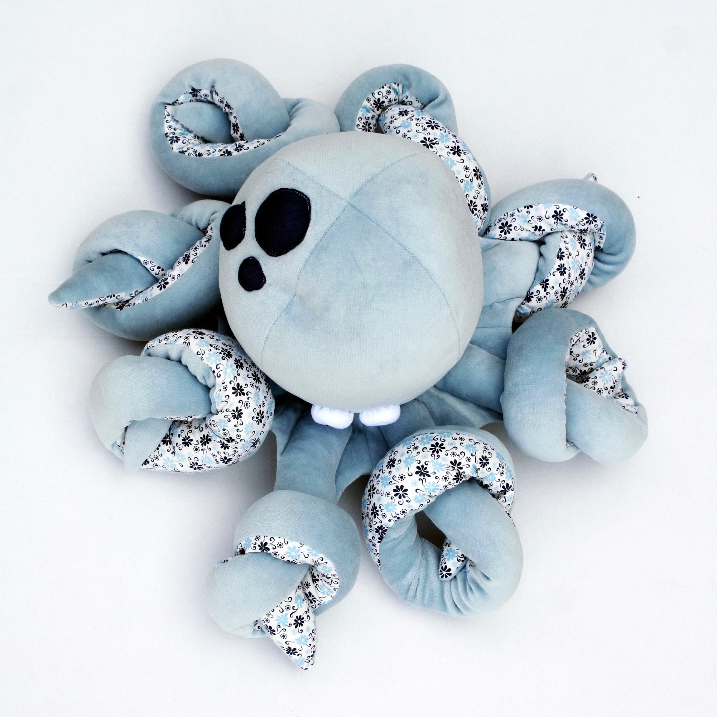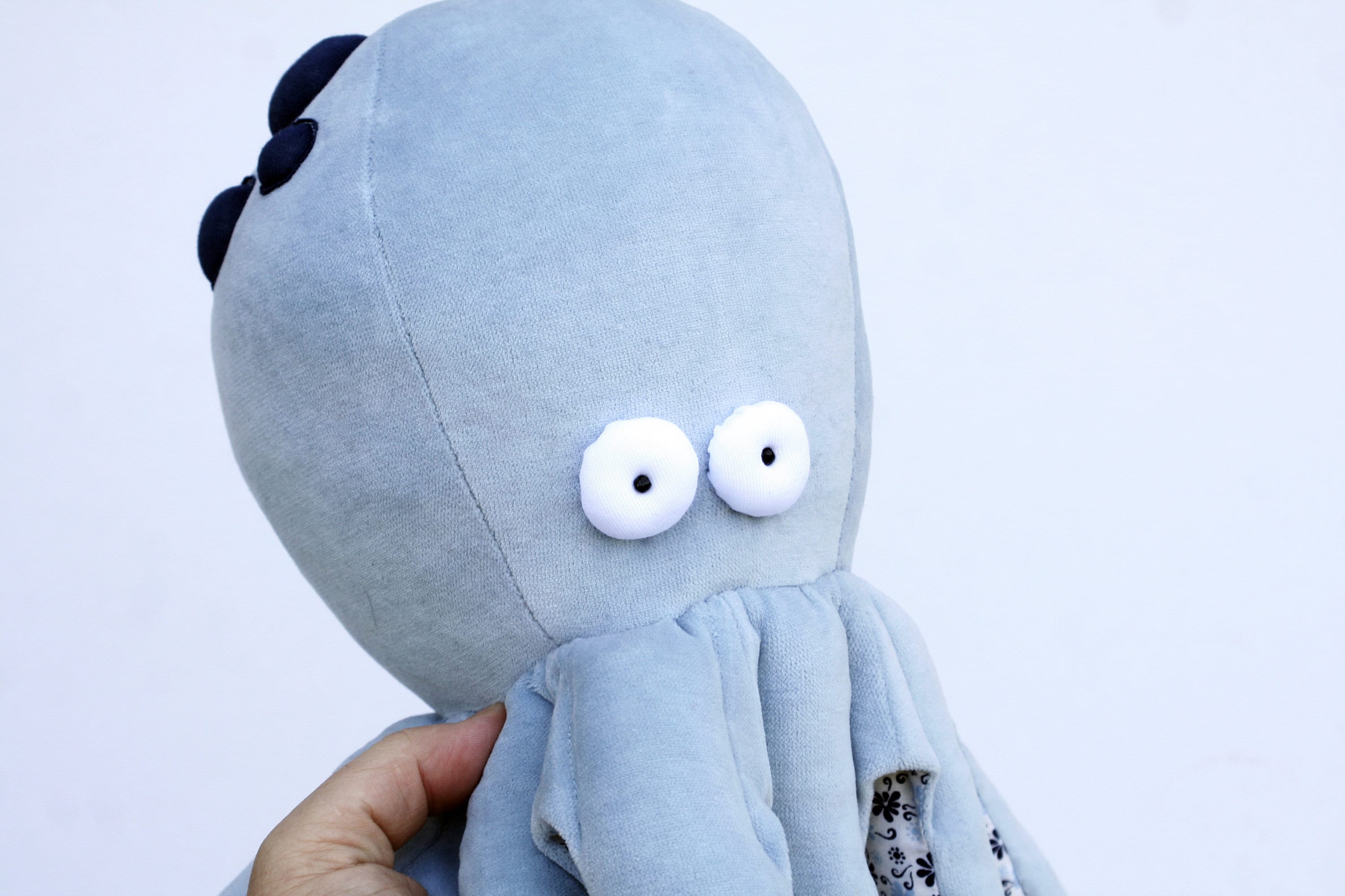 The Octopus is made of high quality, Oeko Tex 100 certified baby plush (upper body) and a canvas (inner body). Pop eyes are made of white je rsey and they have a little bead as pupils - if you would like me to embroider the pupils instead of beads then please write your request to comment.