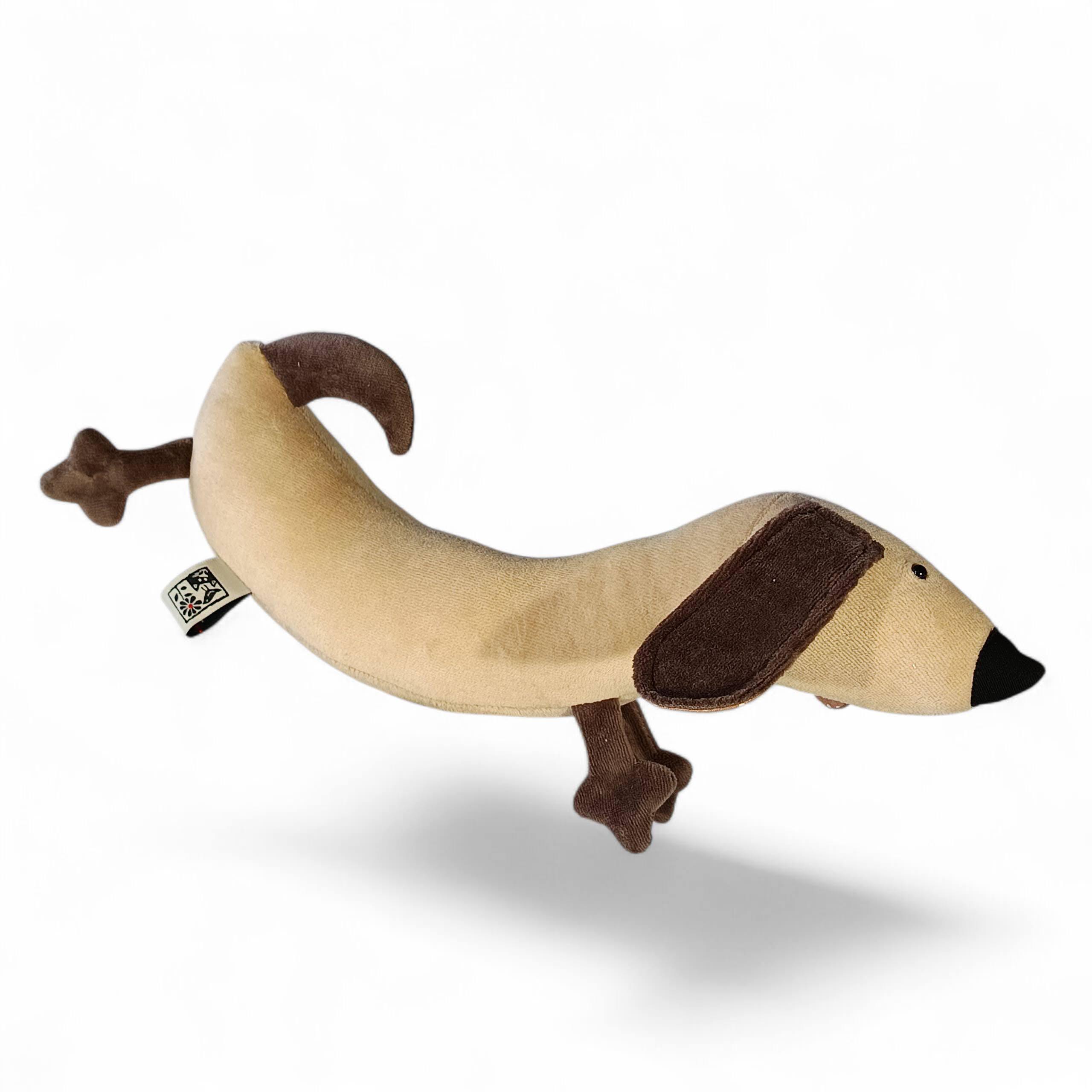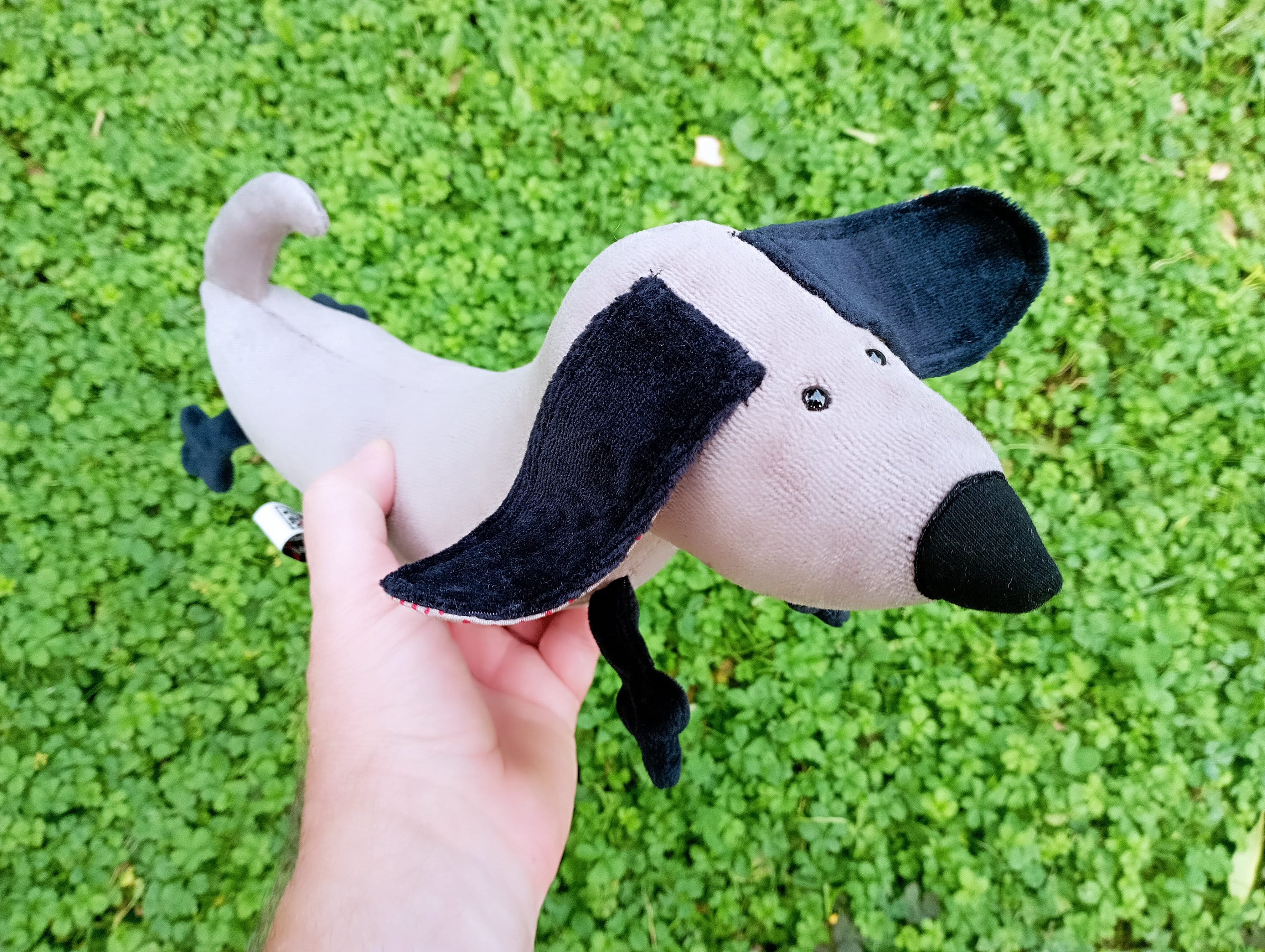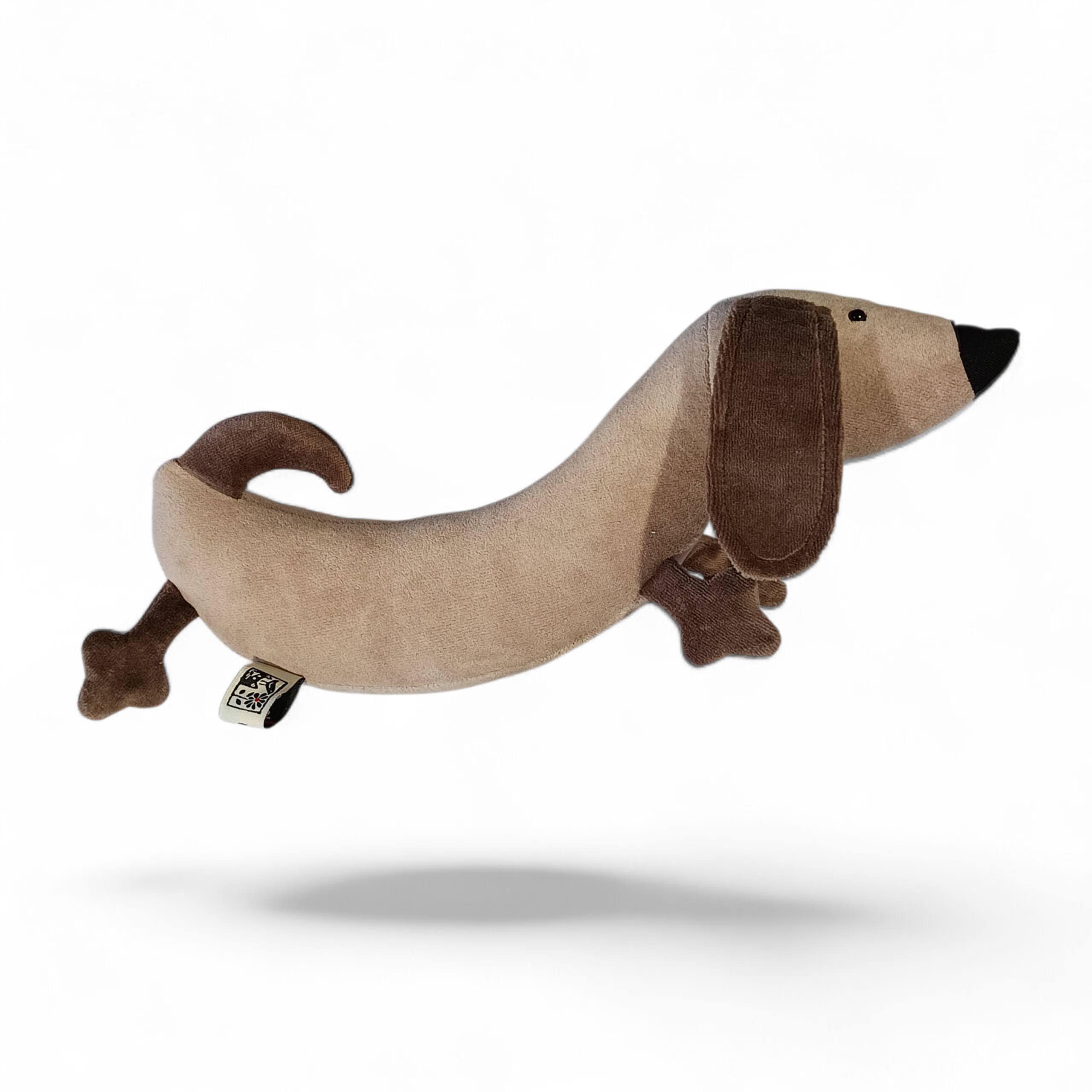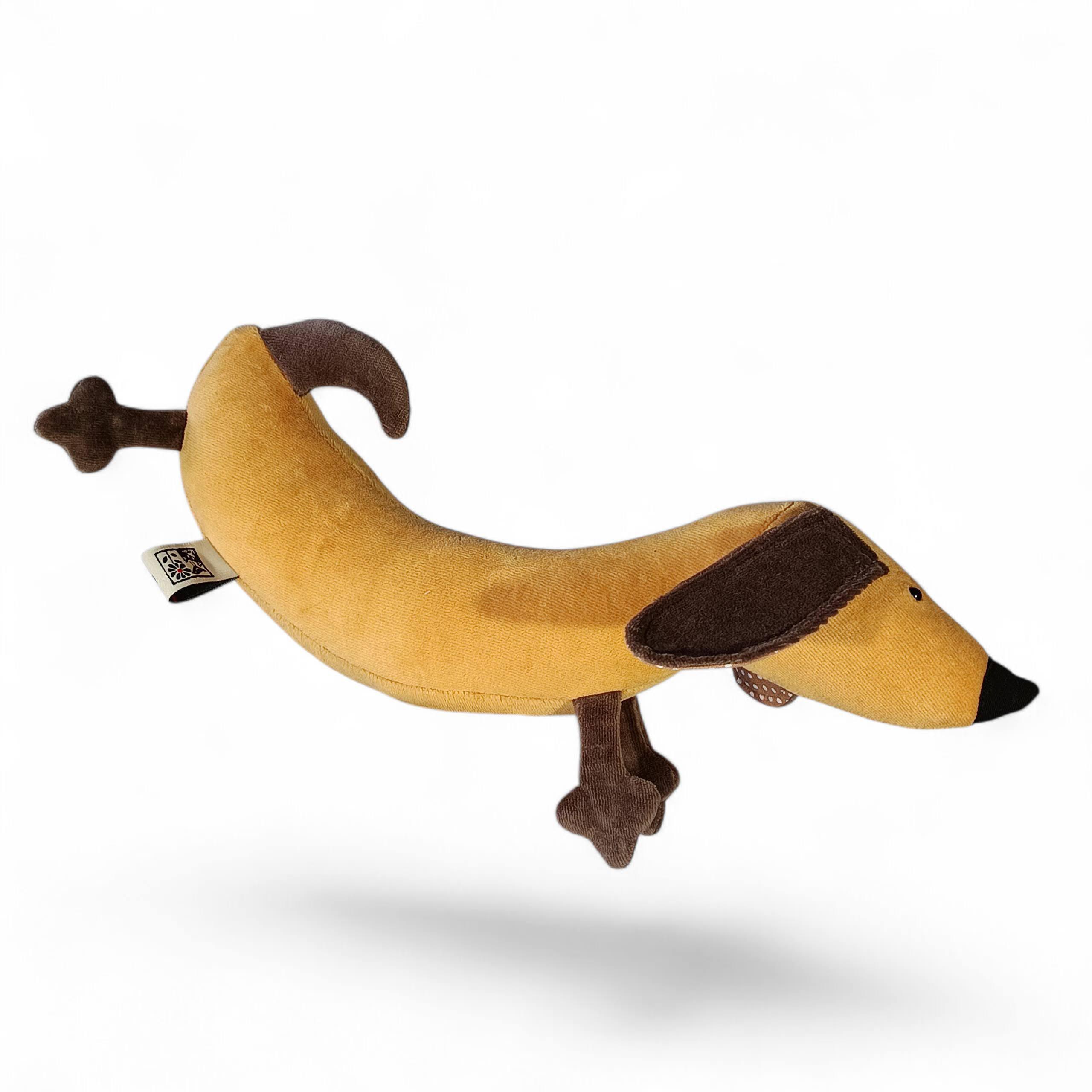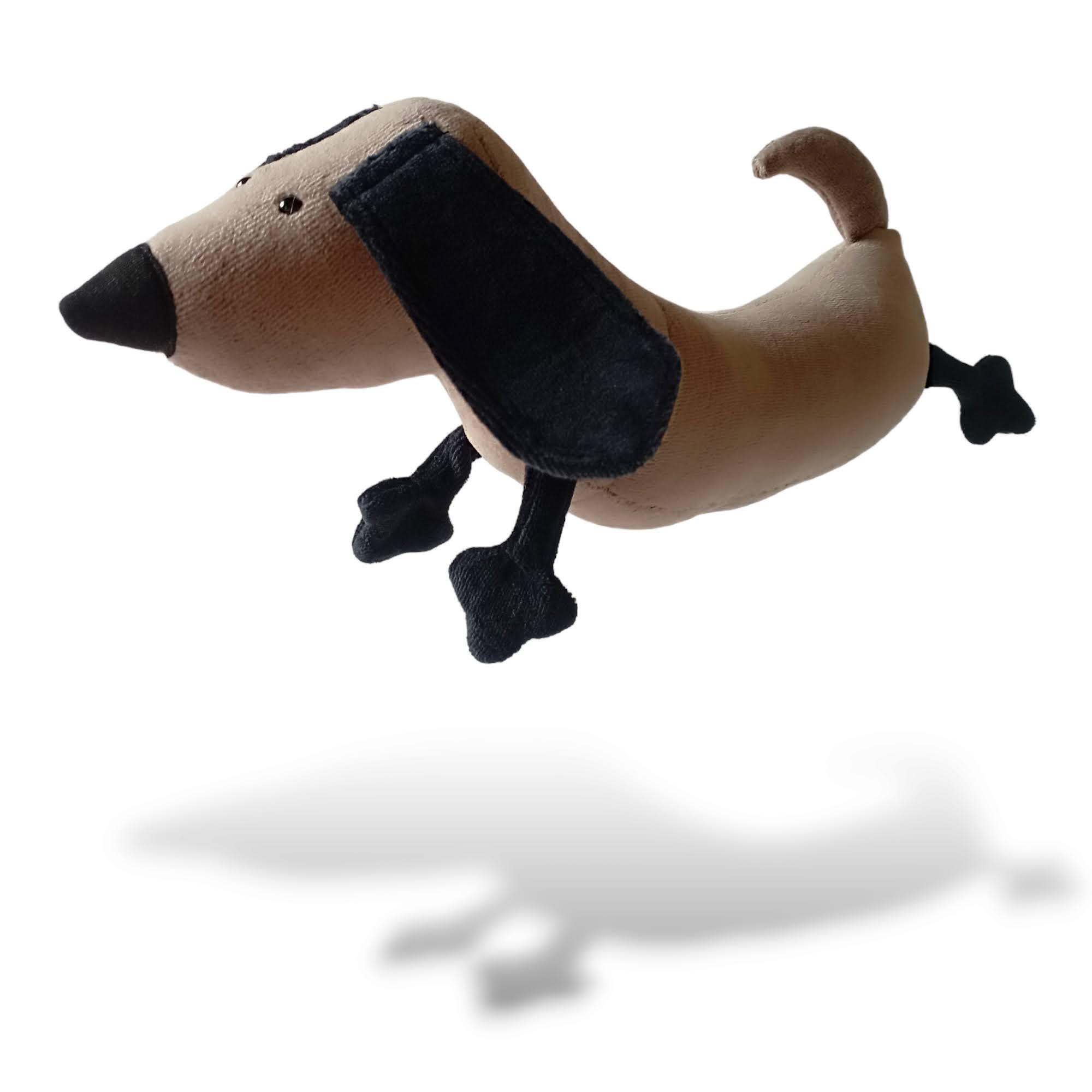 Cute Dachshund Pup plushie made for kids. Body is 35 cm (14") long, made of soft plush. Ears, legs and tail are made of plush, too. Inner ears are made of canvas. The pup has safety eyes.