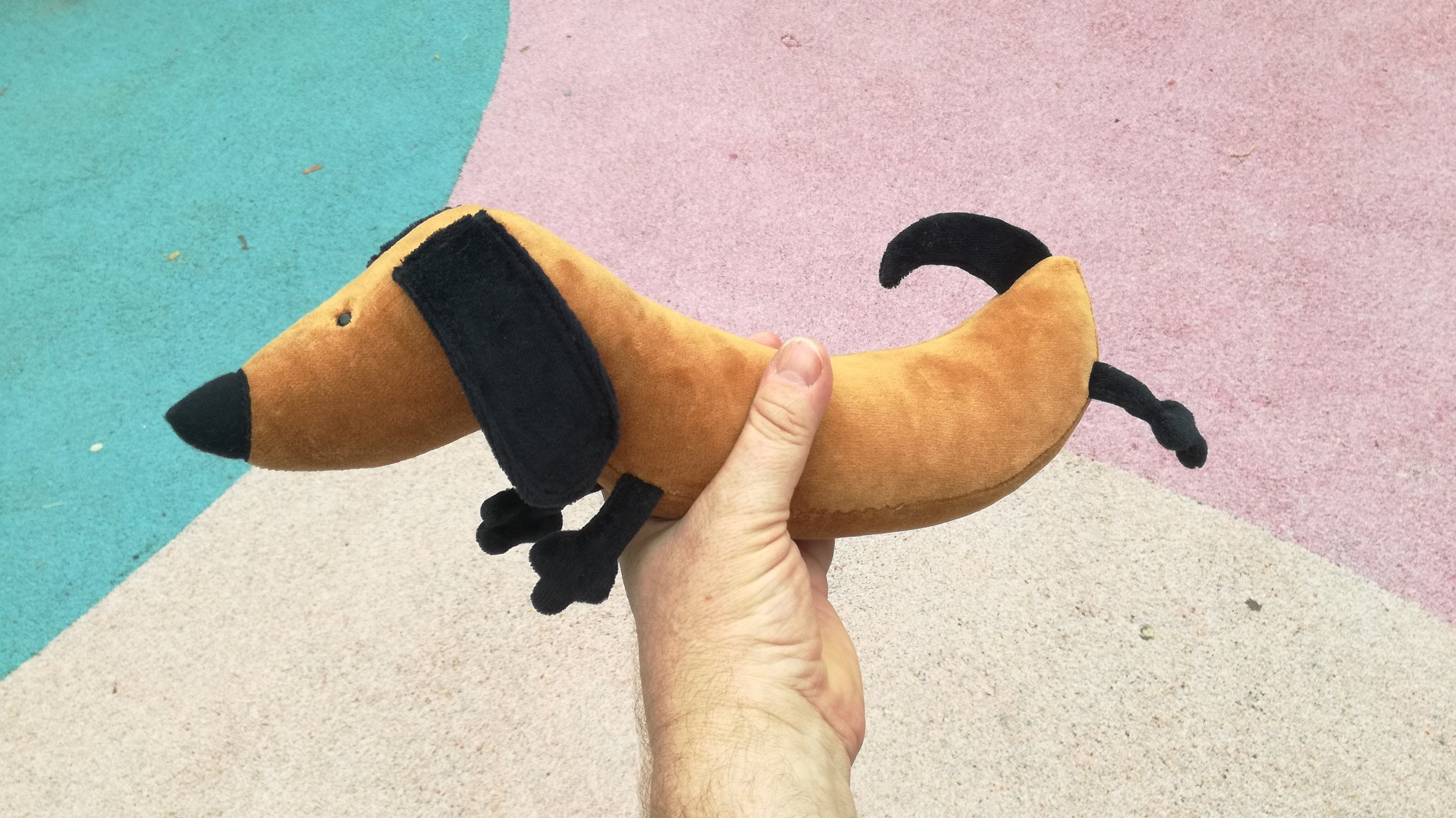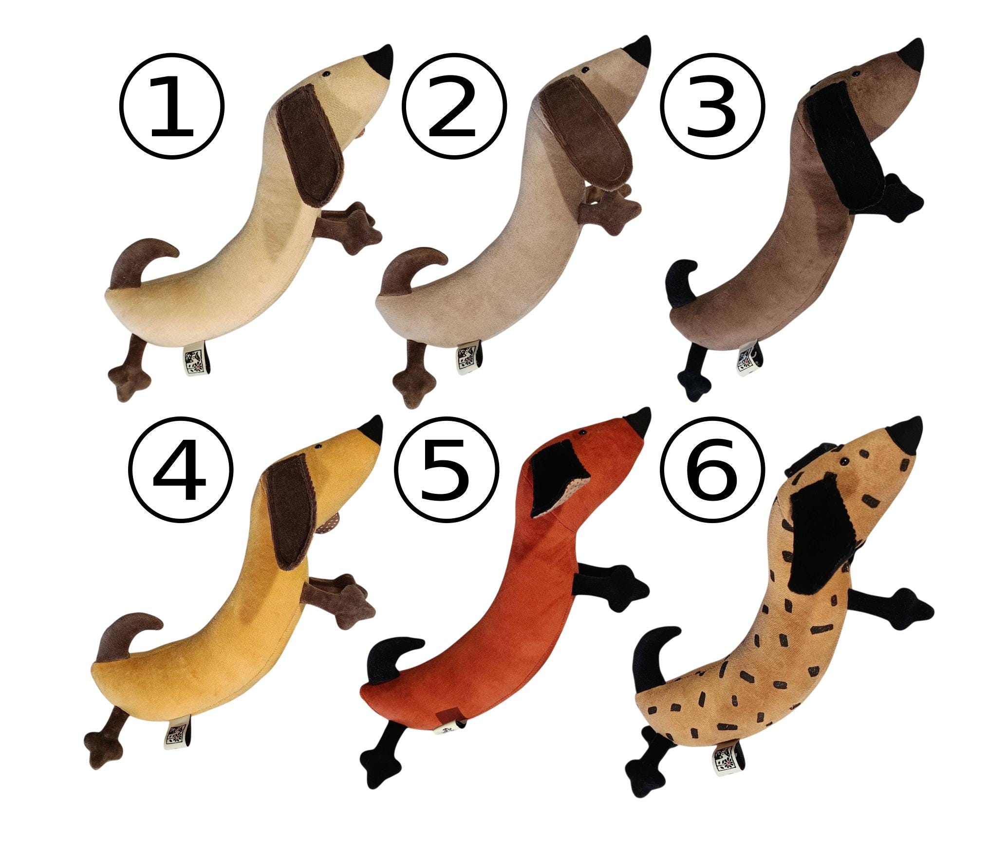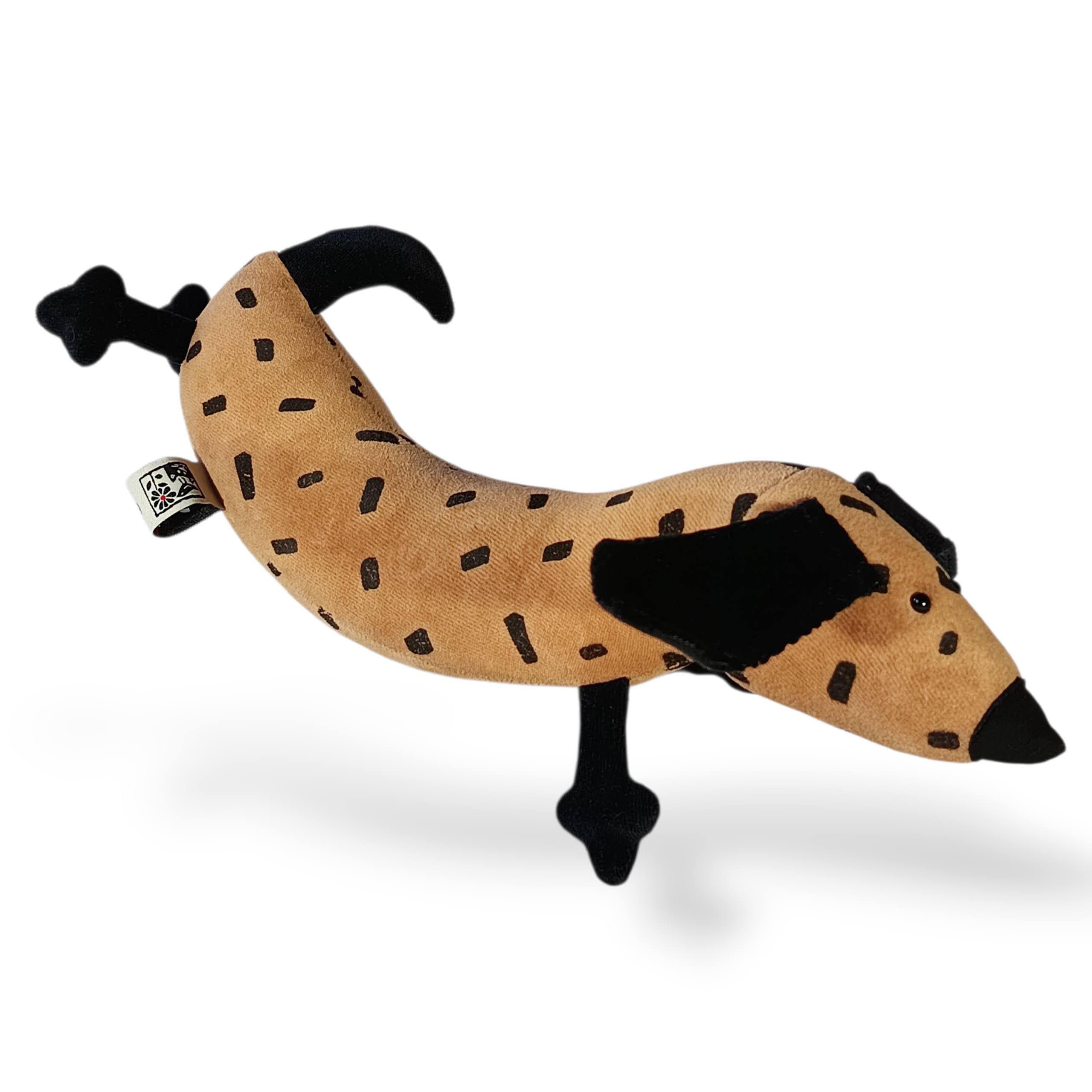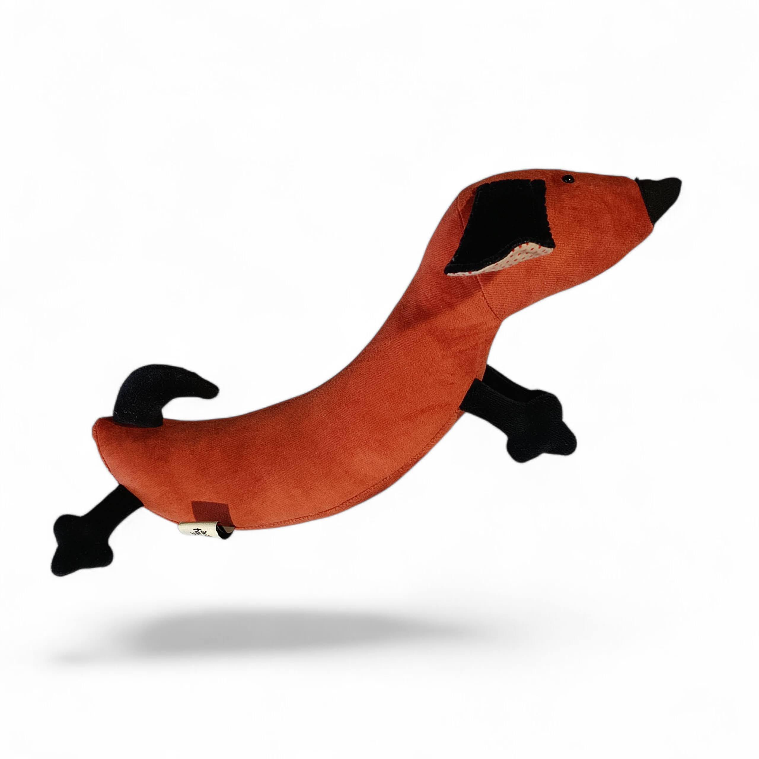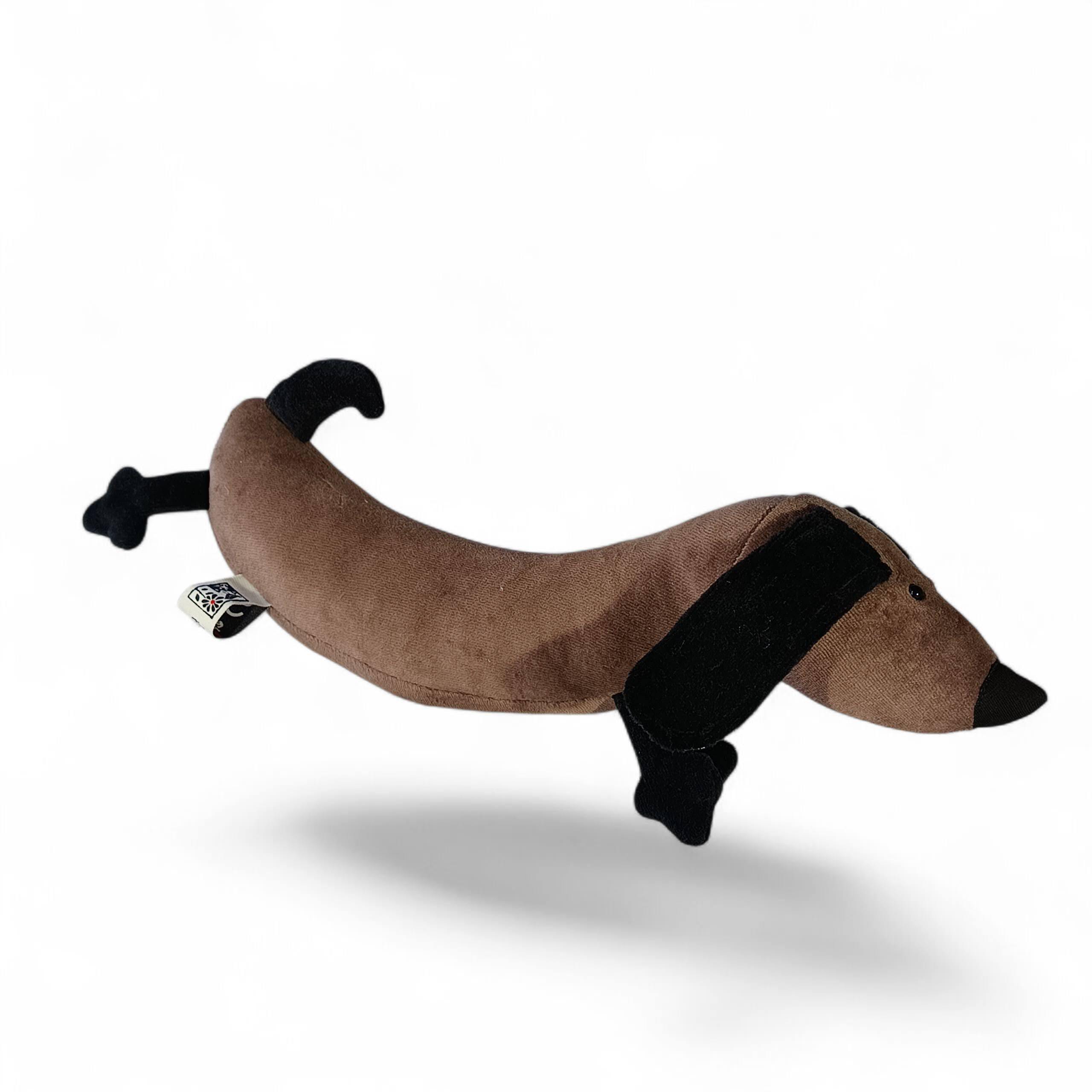 Cute Dachshund Pup plushie made for kids. Body is 35 cm (14") long, made of soft plush. Ears, legs and tail are made of plush, too. Inner ears are made of canvas. The pup has safety eyes.