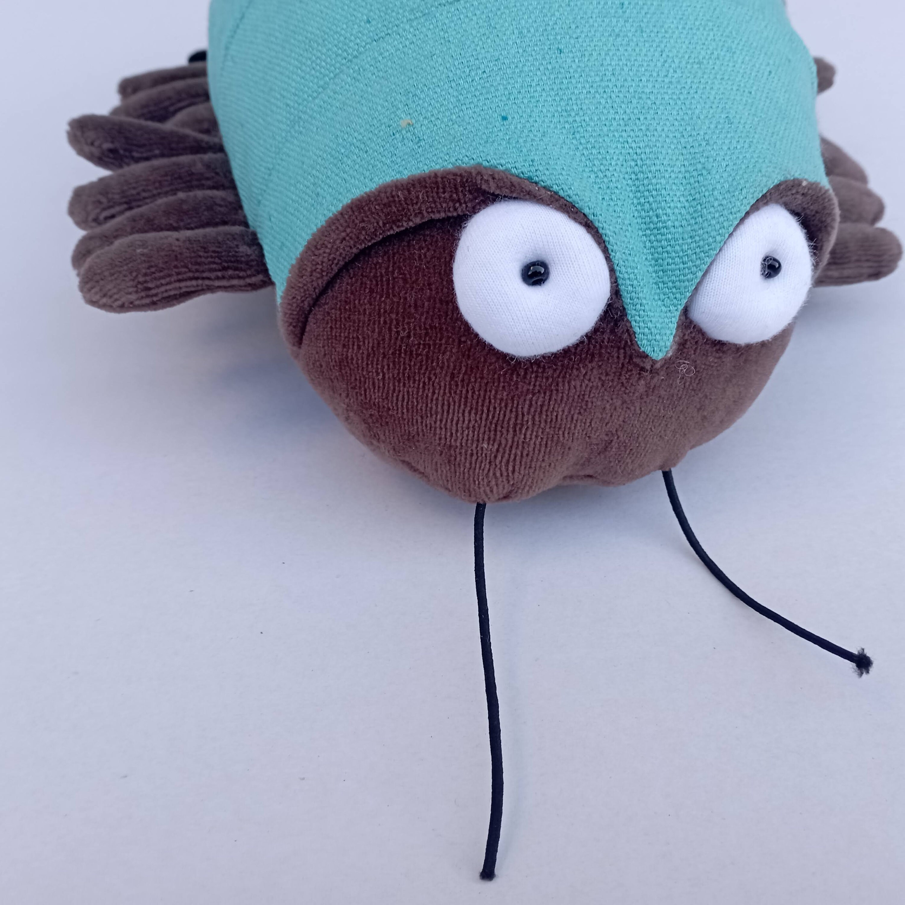 My Pillbug is made of turquise upholstery canvas (back) and brown plush (tummy and legs). He has huge white pop eyes made of jersey (small black beads as pupils) and his antenna is made of rubber cord.