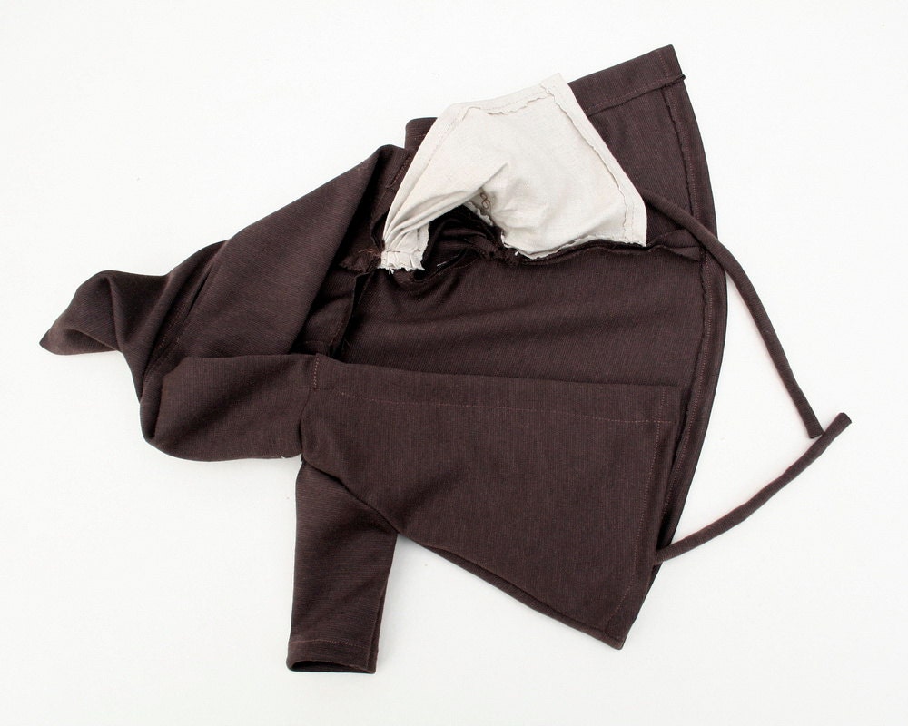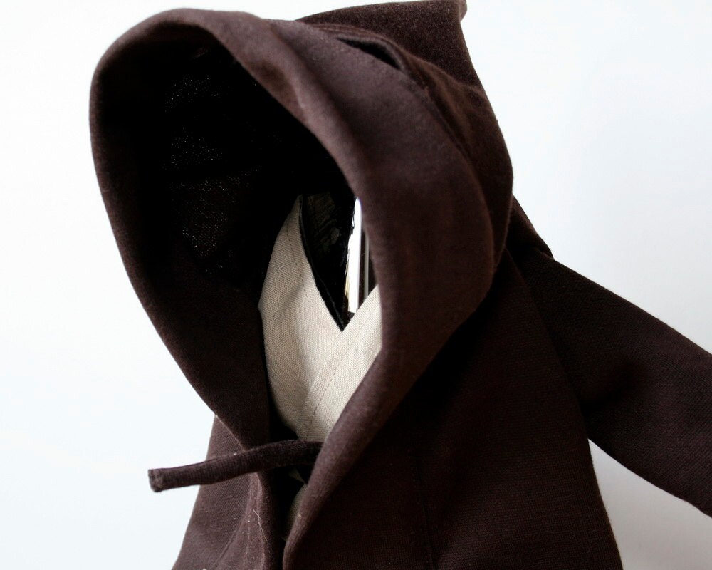 Little animals like new clothes as we do. Now you can dress up your beloved friends as a Jedi . It is a dark brown robe and it has a vest attached to it. The hood have two holes for the ears. The coat is made of soft brown fabric and the vest is made of canvas.