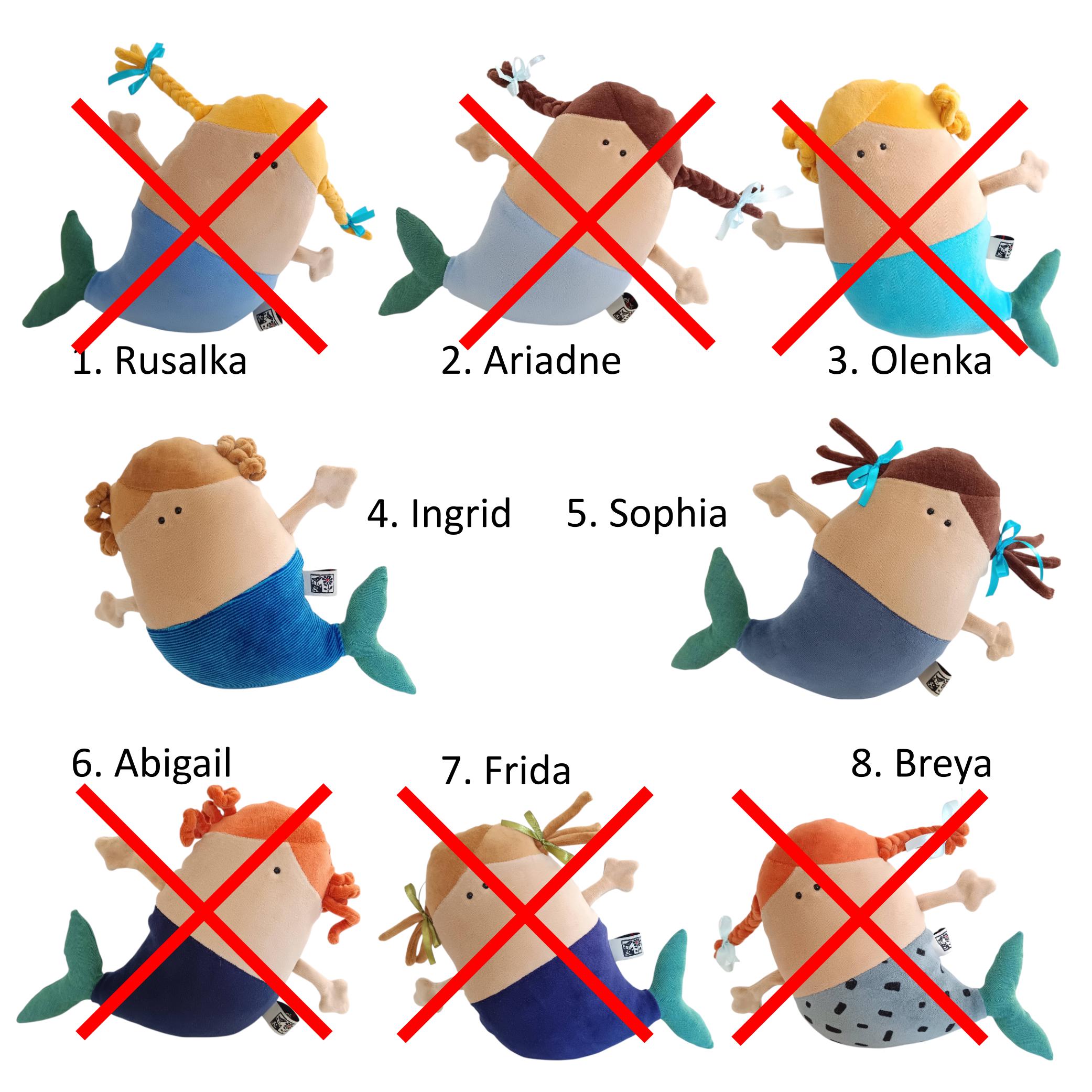 The Mermaid's body is about 10" (25 cm). Made of high quality, Oeko Tex 100 certified plush fabric. The tail is made of canvas. Eyes are safety button. The Mermaid is stuffed with high quality siliconized polyfill. Machine washable using mild detergent, low temperature. Can be tumble dried. Baby safe item.