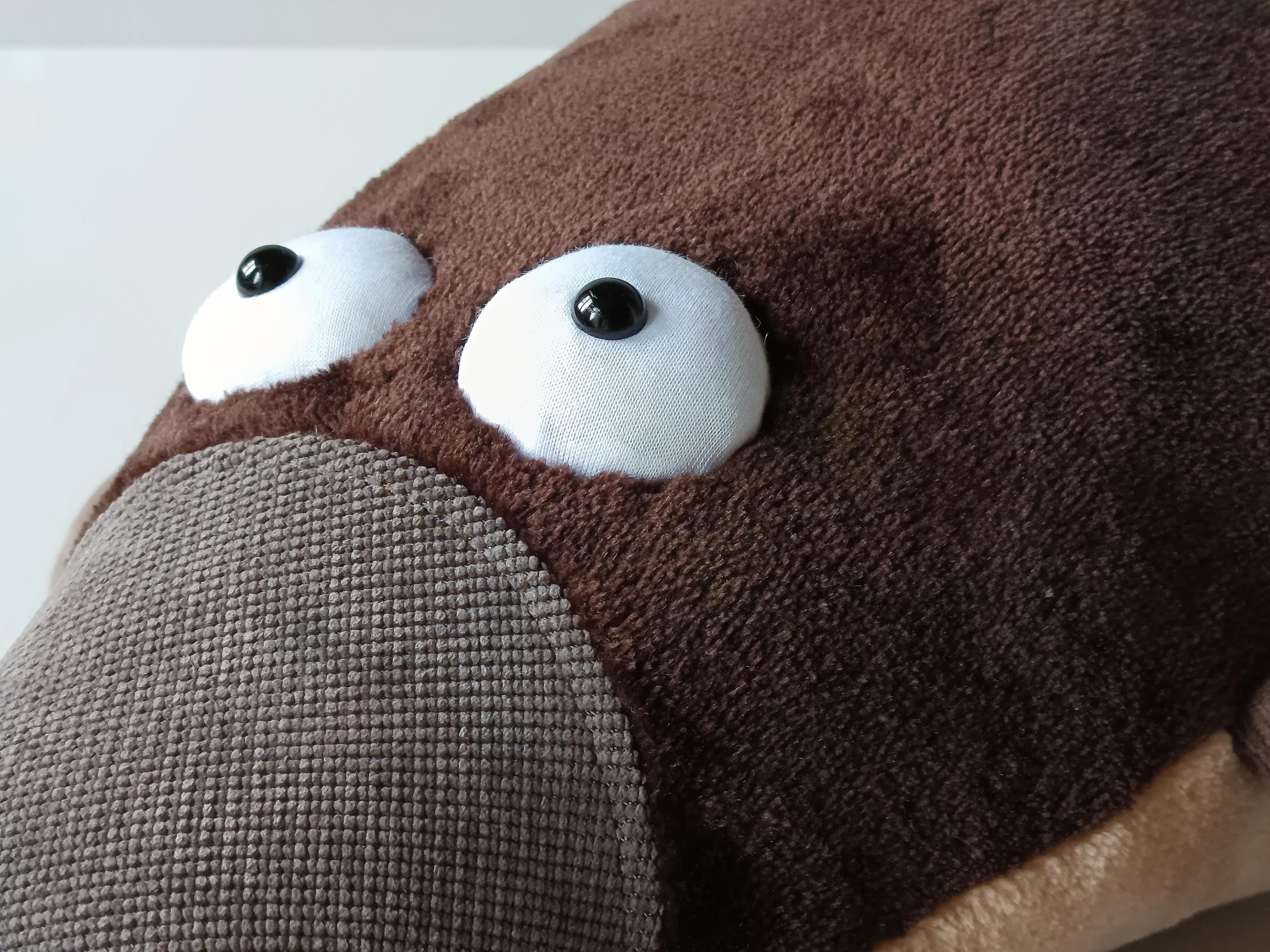 The fat body is brown (back is dark brown, belly is beige), has brown bill and a little brown limbs. He has big pop eyes are made of white fabric.