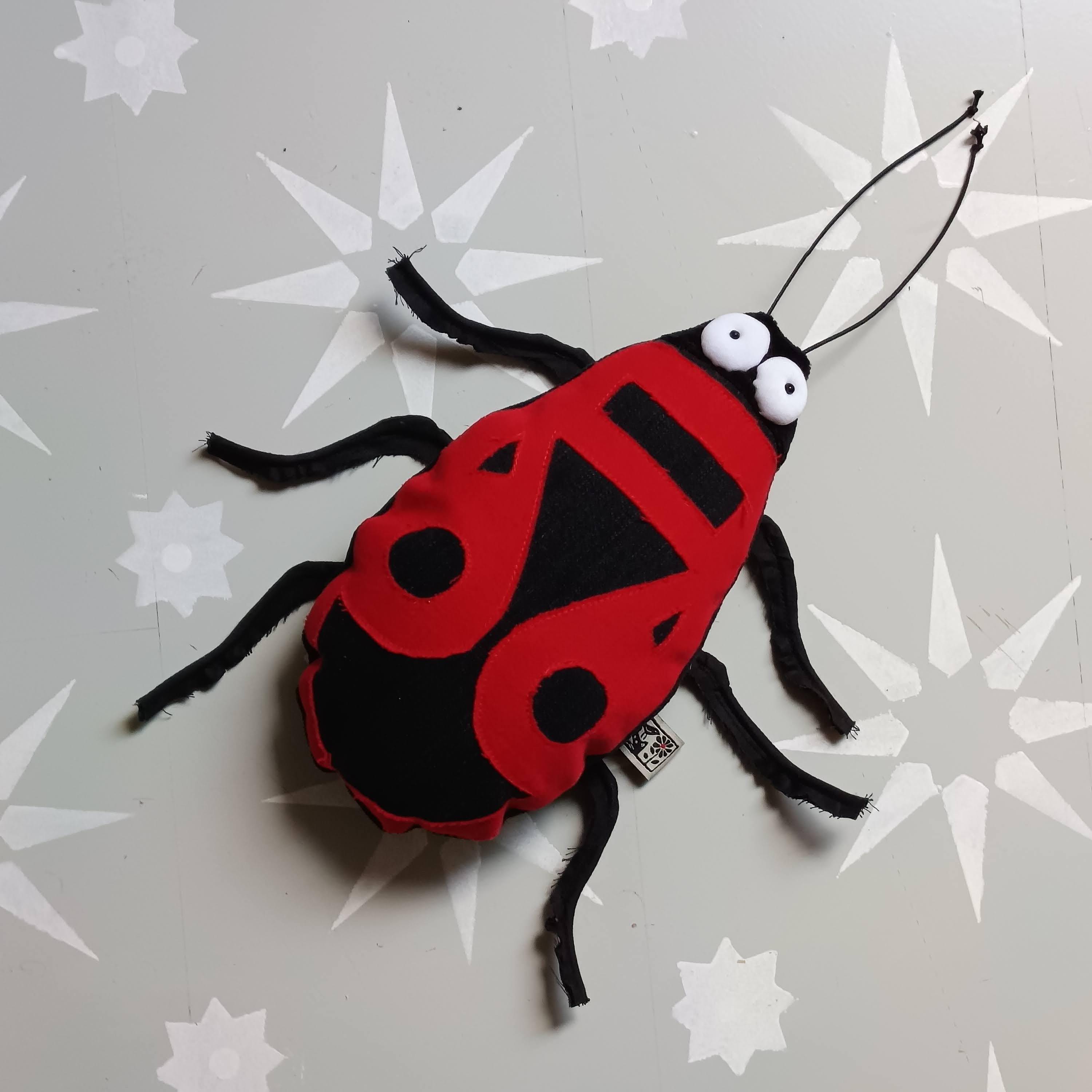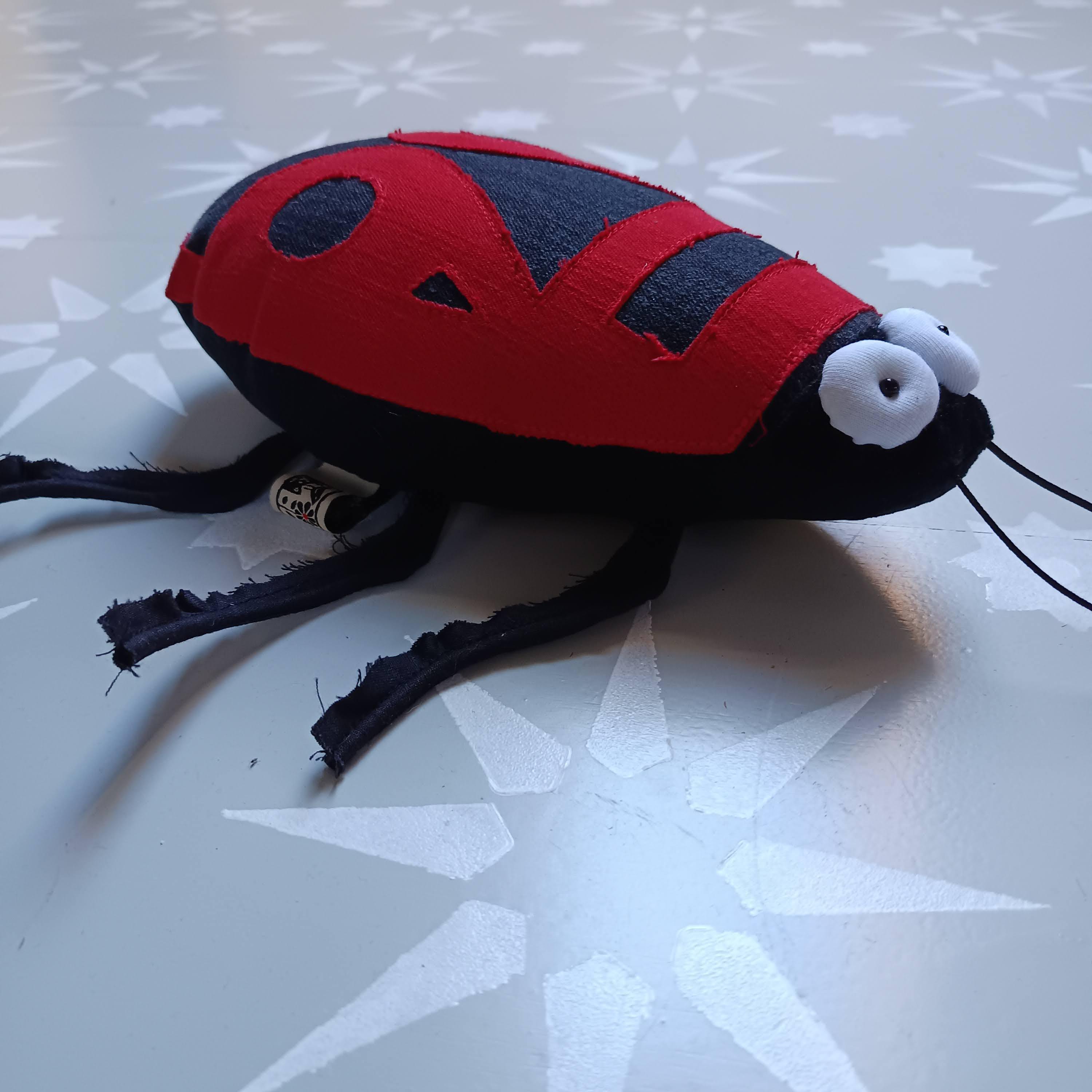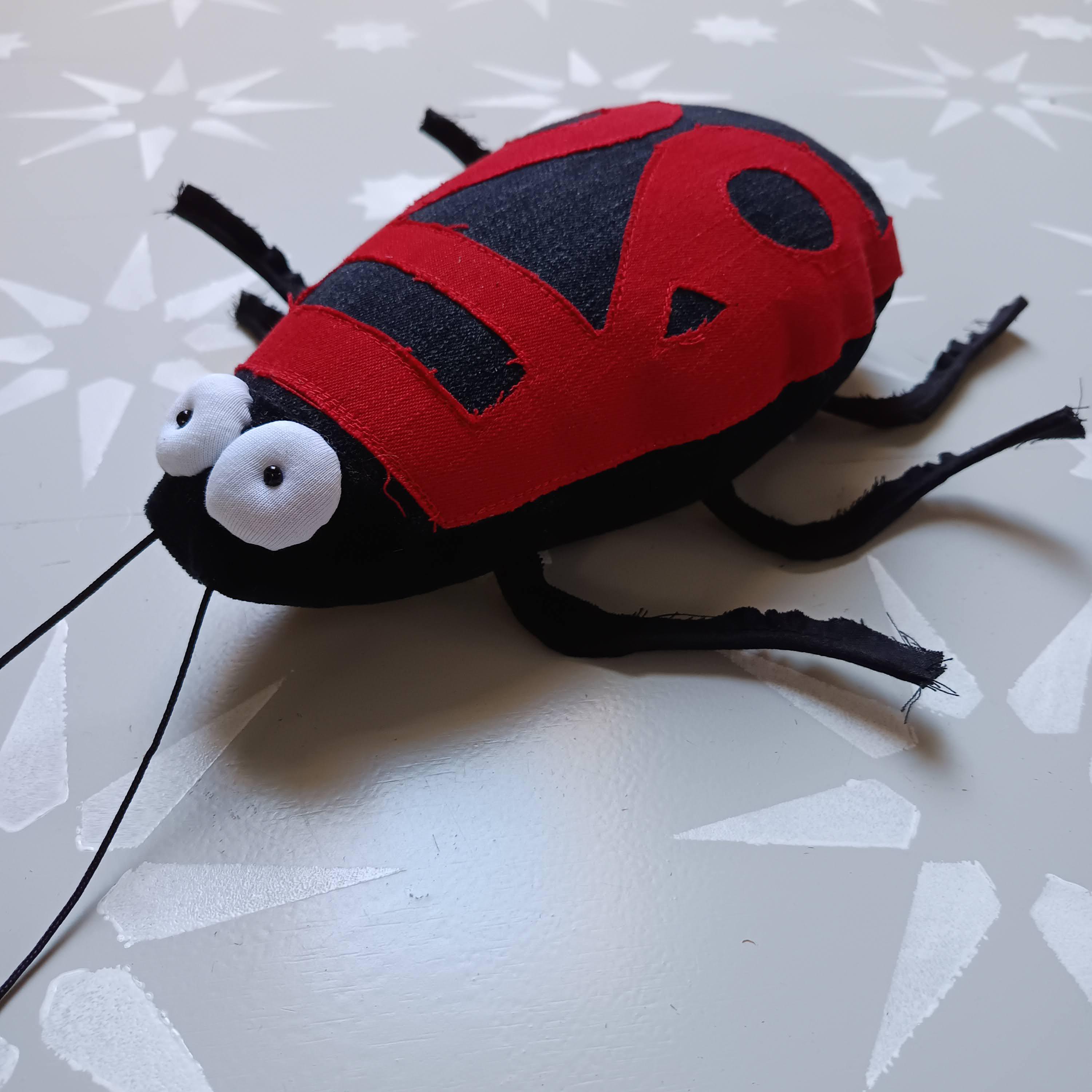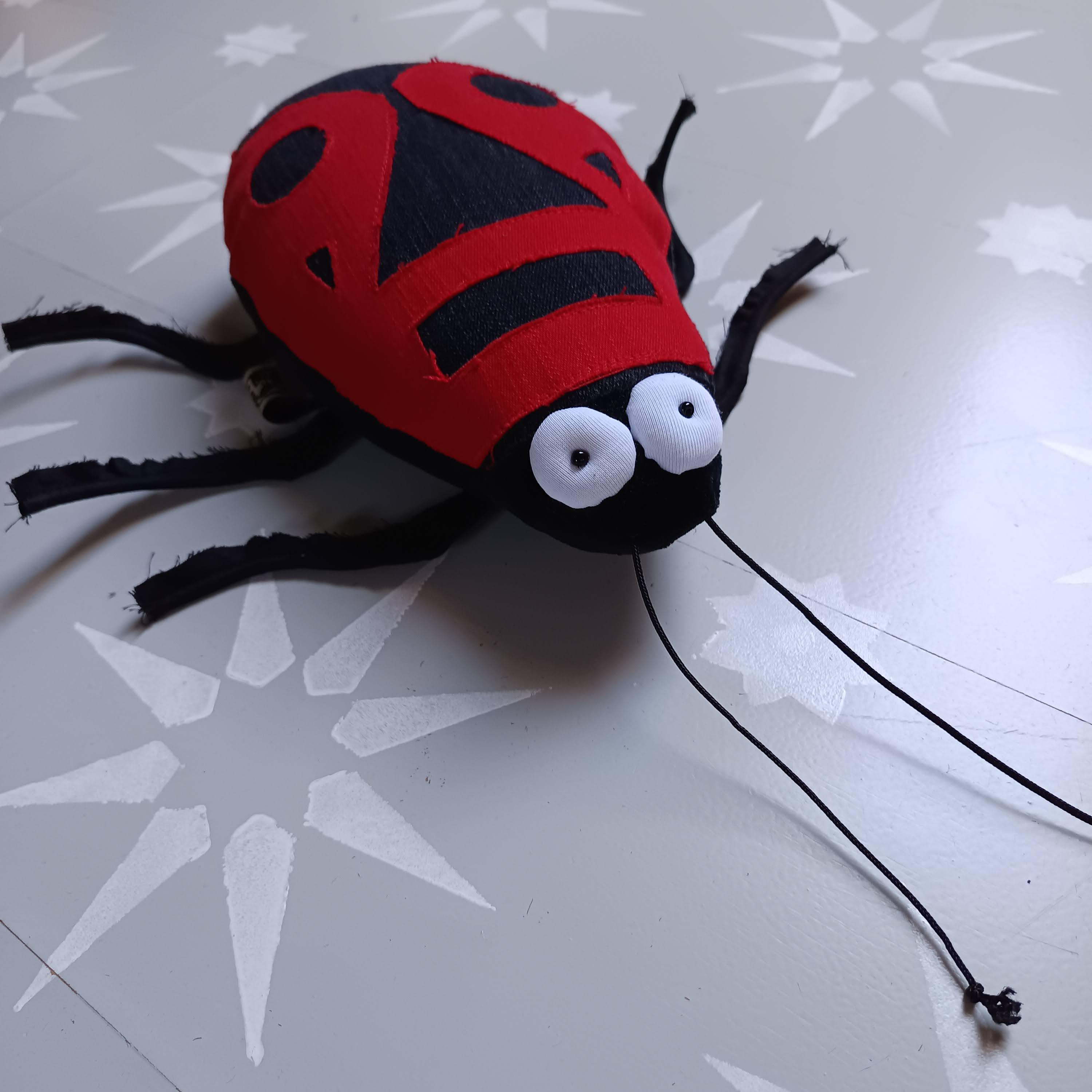 Upper body is made of red and black denim (recycled from jeans), other body parts are made of plush and some canvas. Legs and antenna are made of rubber cord. Stuffed with polyfill. Eyes are made of white jersey and have a little pearl as pupil.