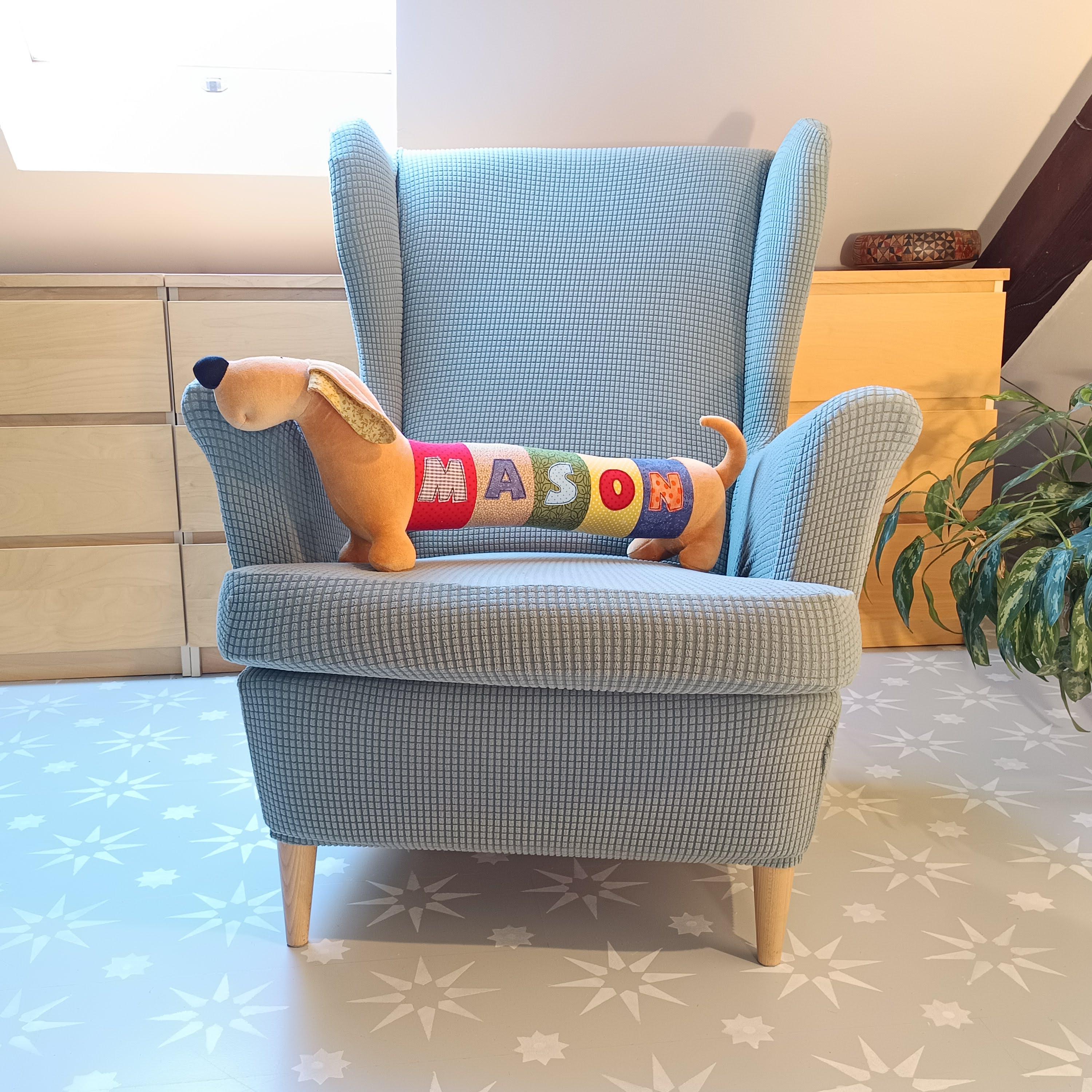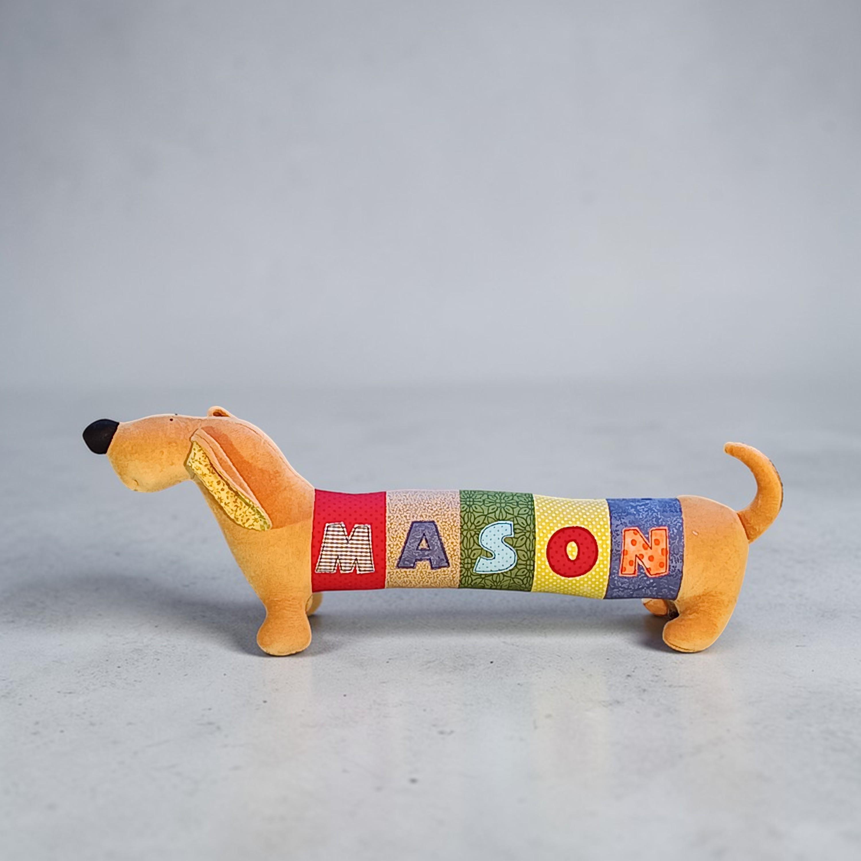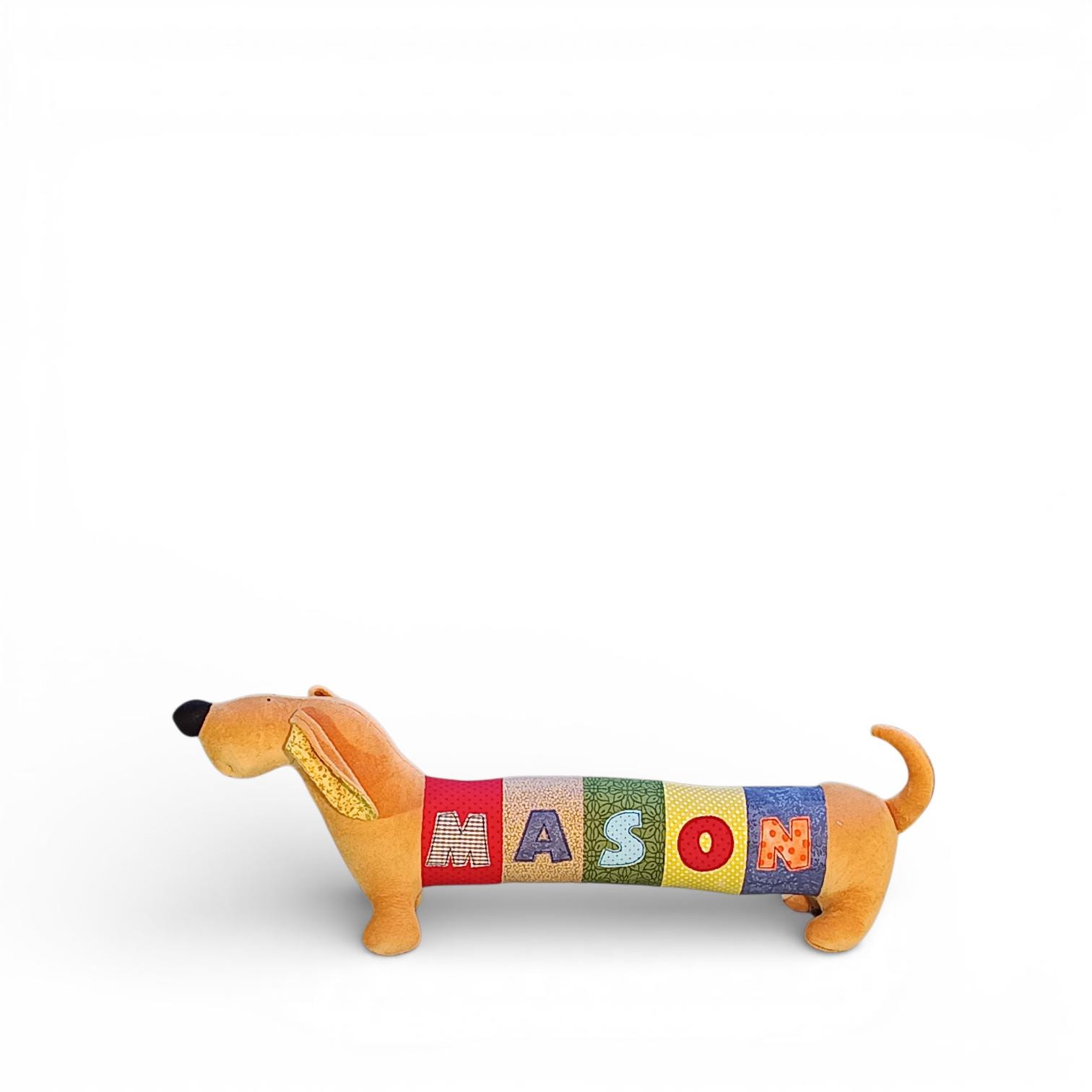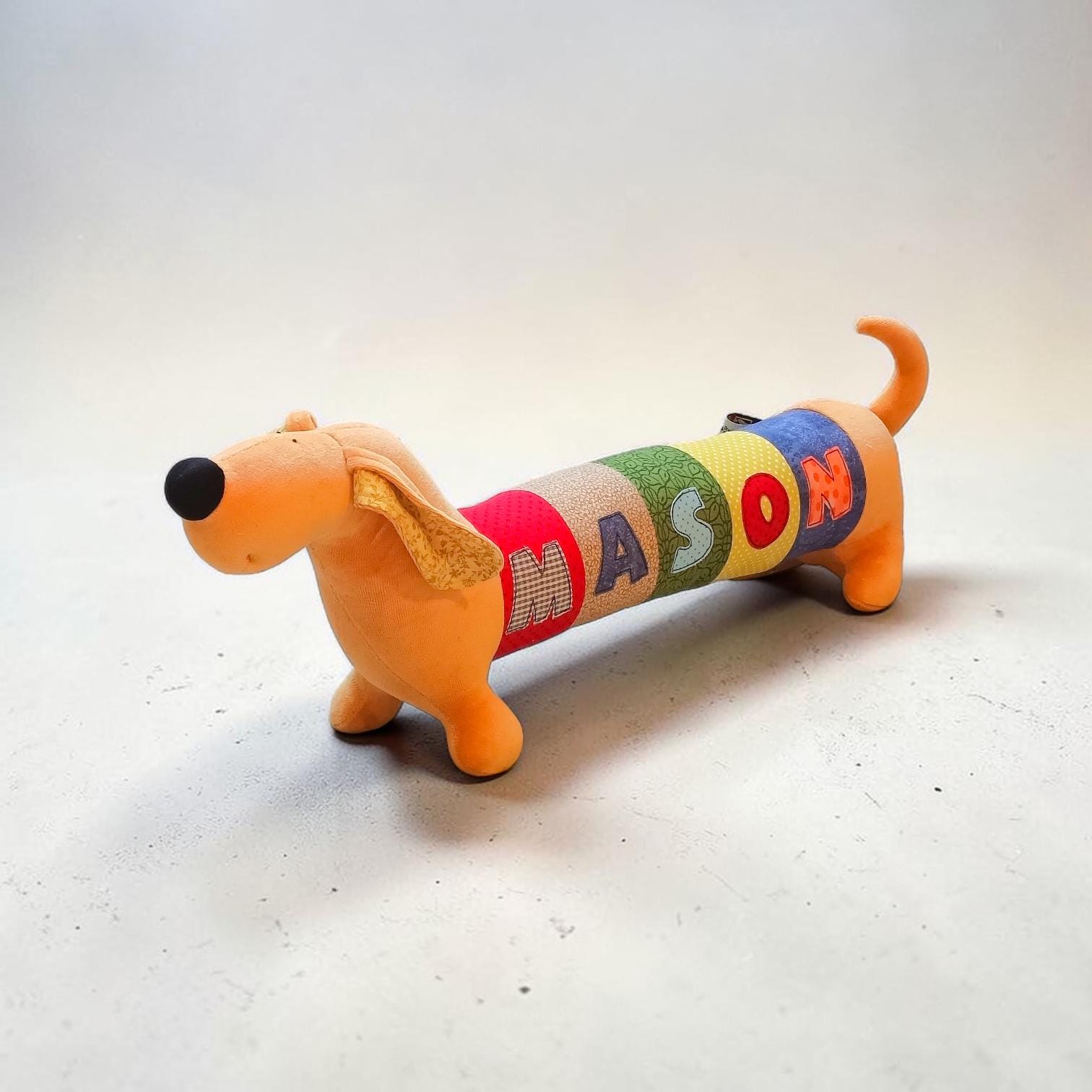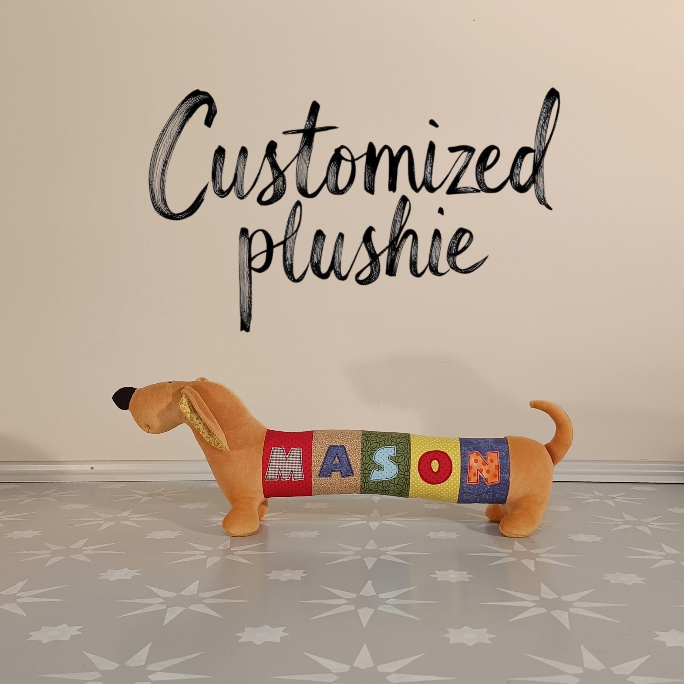 This personalized stuffed animal is a handmade dachshund plush toy with your child’s name sewn into the body.