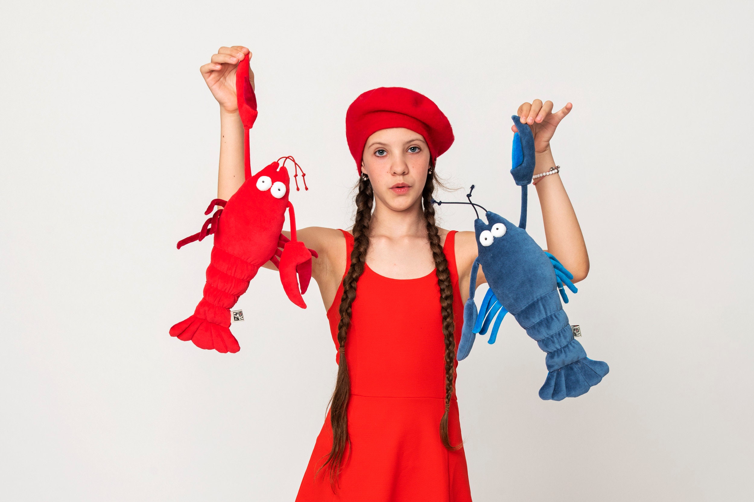 These red or blue Lobster are made of Oeko Tex 100 Standard certified high quality plush. Its belly is made of cotton. Belly color and pattern might be different, it depends on the availability of the fabric. Pop eyes are made white canvas and a small bead - not available for babies!. Claws are soft, made of plush, too. Its antennas are made of rubber cord.