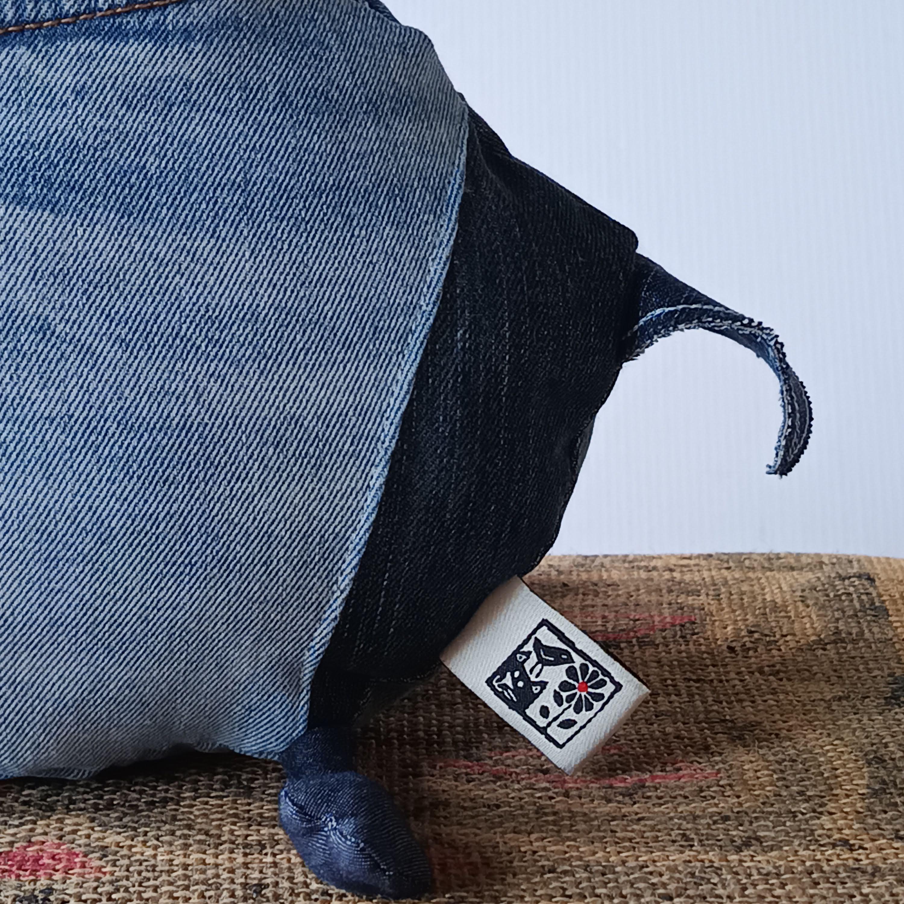 His fat body is 15" (38 cm) long from the head to the tail. His body is made of two different pieces of old blue jeans. Eyes are safety buttons, suitable for small children as well. Stuffed with high quality siliconized polyfill. Machine washable the same way as any other jeans.