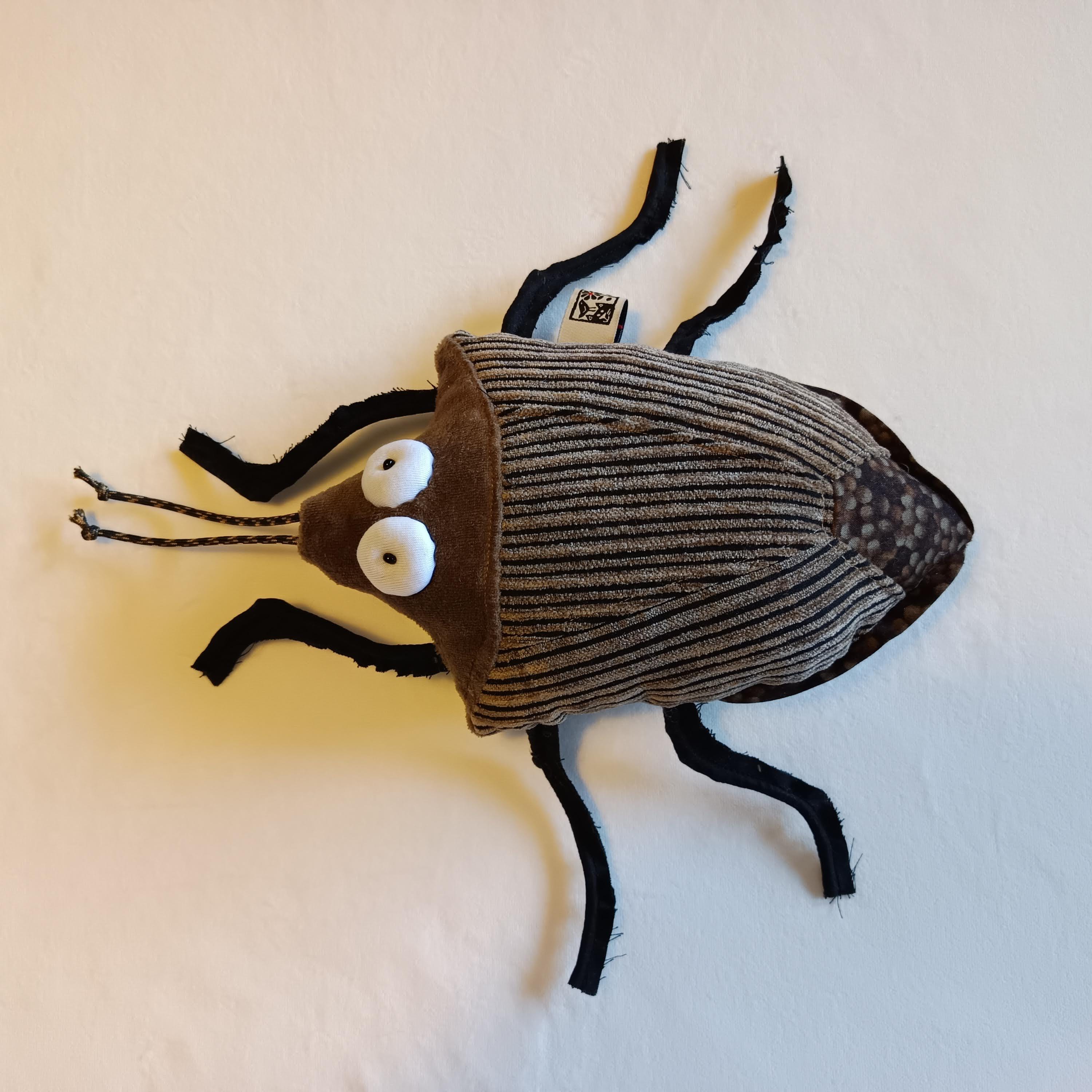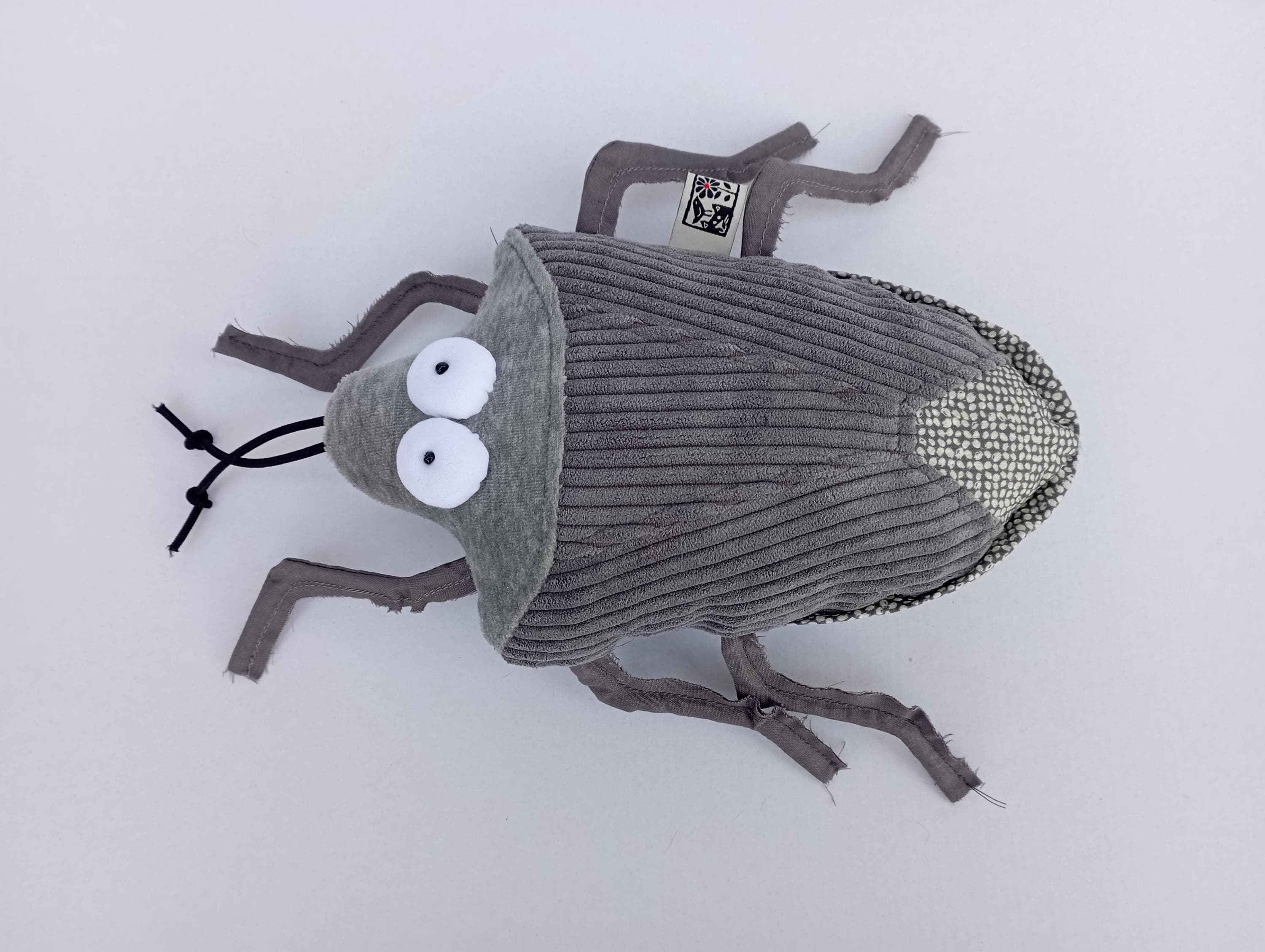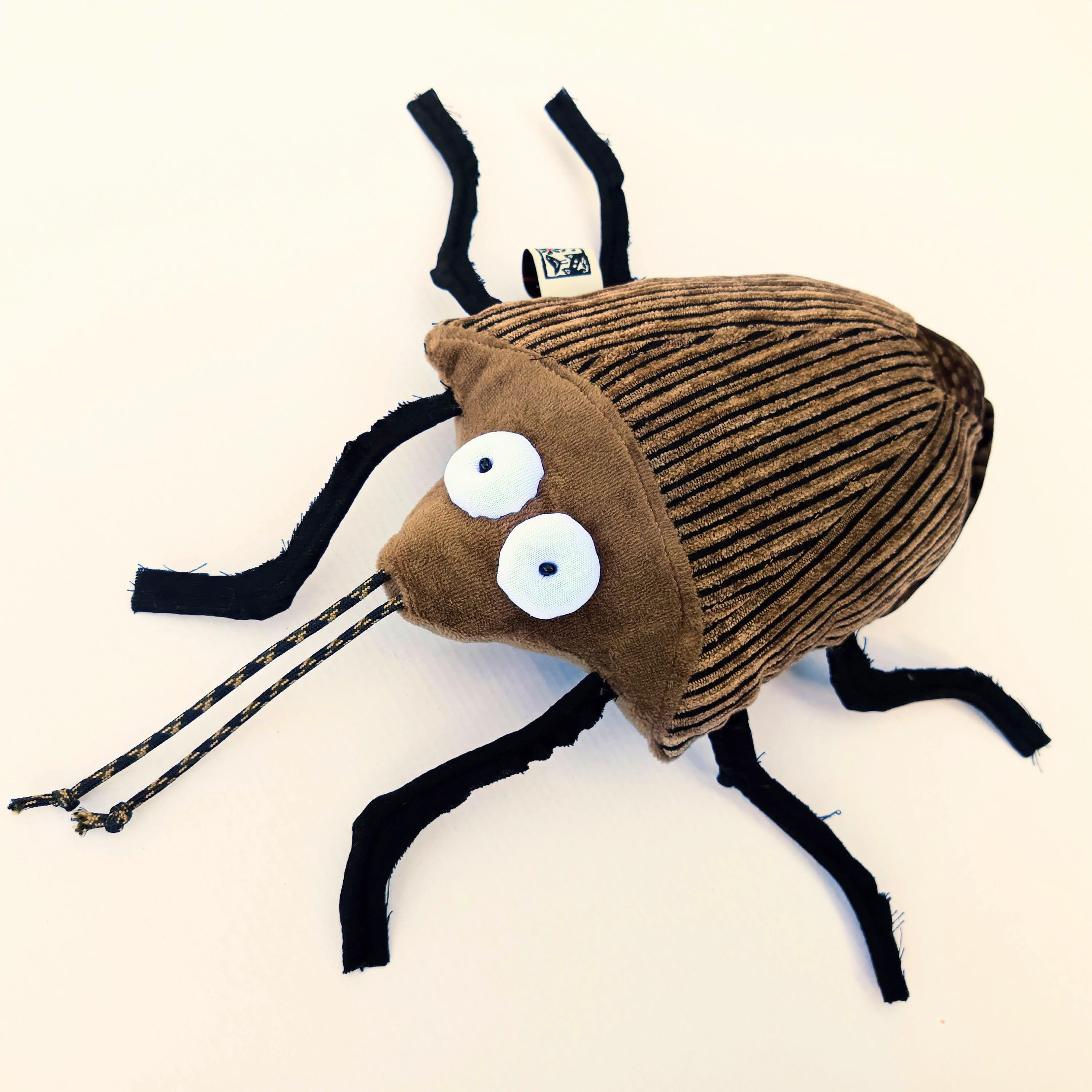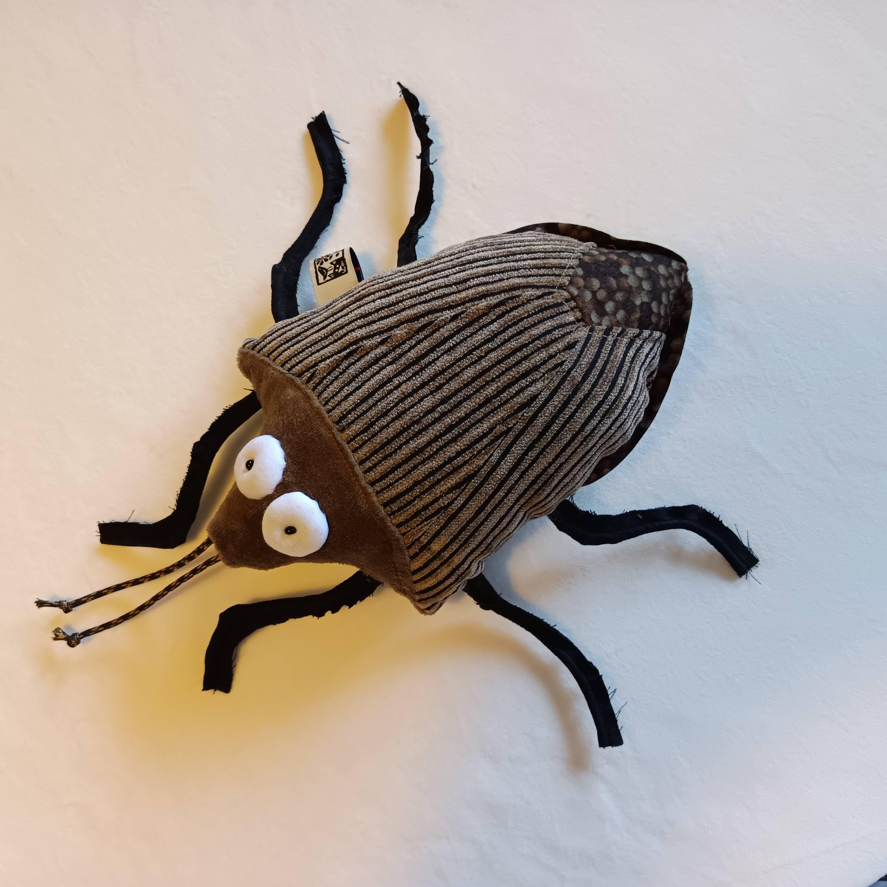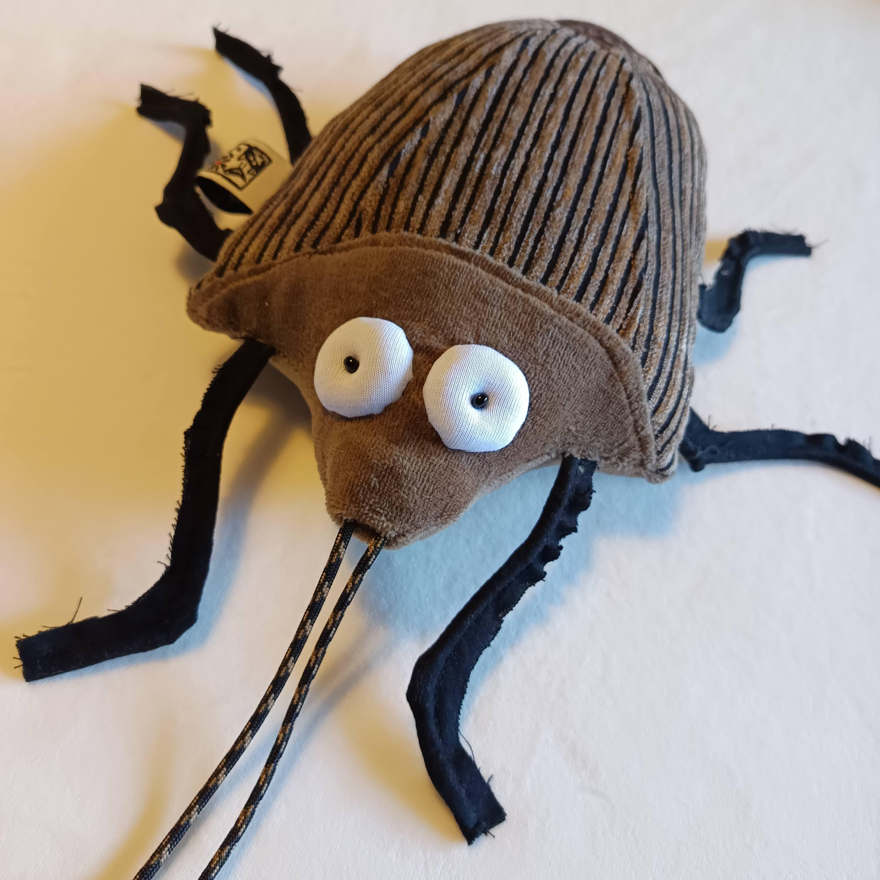 Body is made of plush and some upholstery. Legs and antenna are made of rubber cord. Stuffed with polyfill. Eyes are made of white jersey and have a little pearl as pupil.