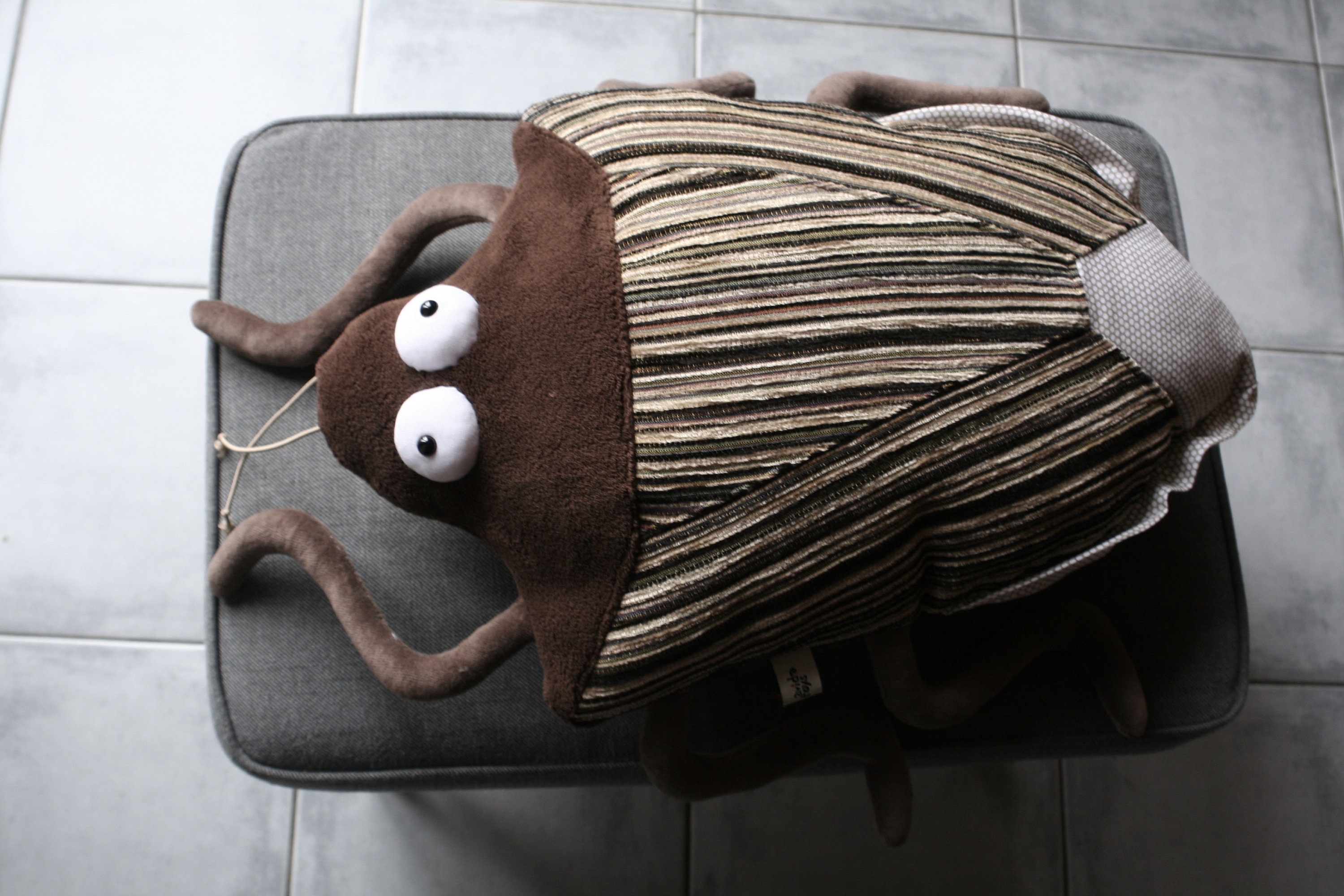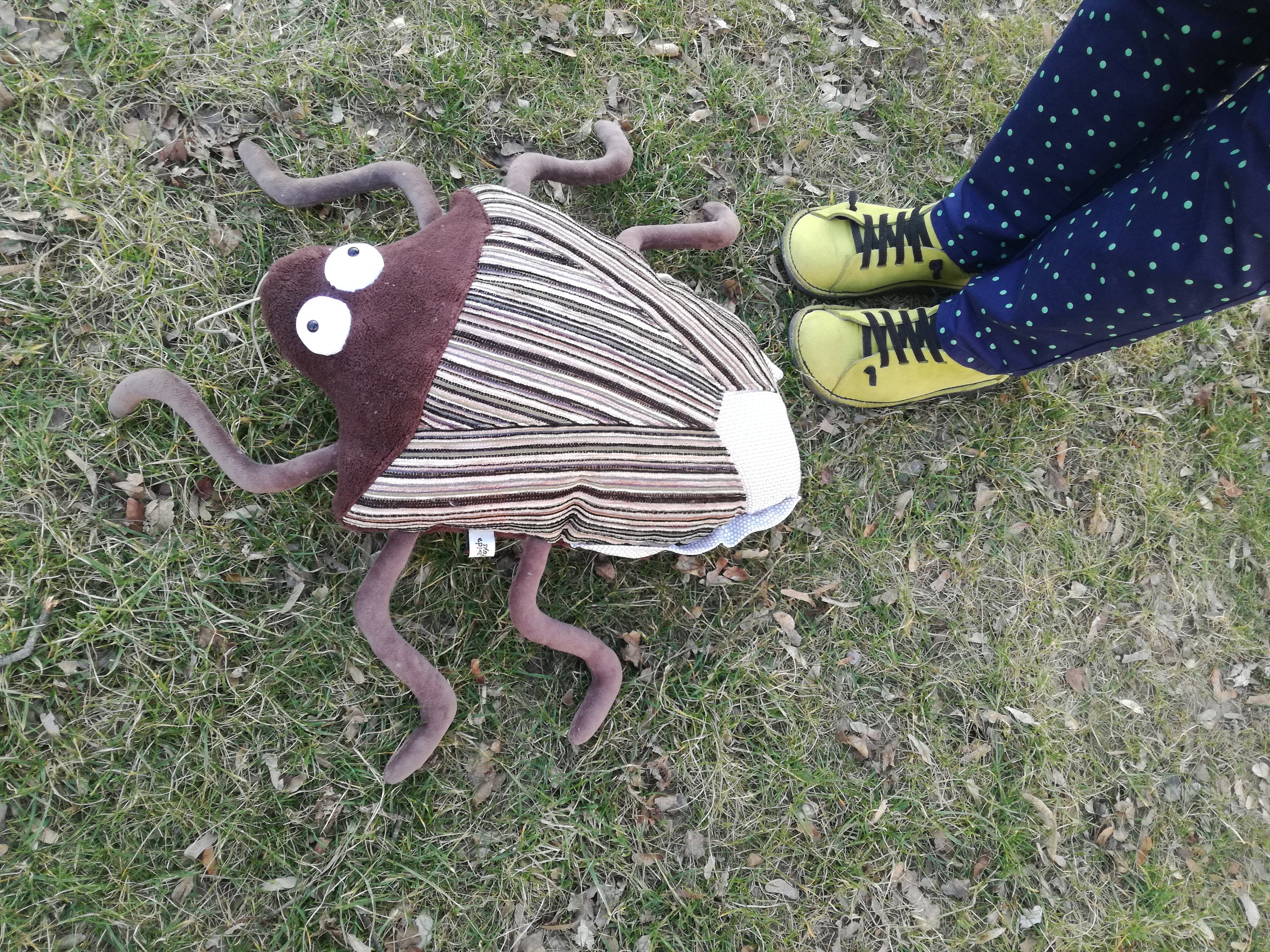 Body is made of Wellsoft and some upholstery. Legs are made of plush, antennas are made of rubber cord. Stuffed with polyfill. Eyes are made of white jersey and have a safety eye as pupil.